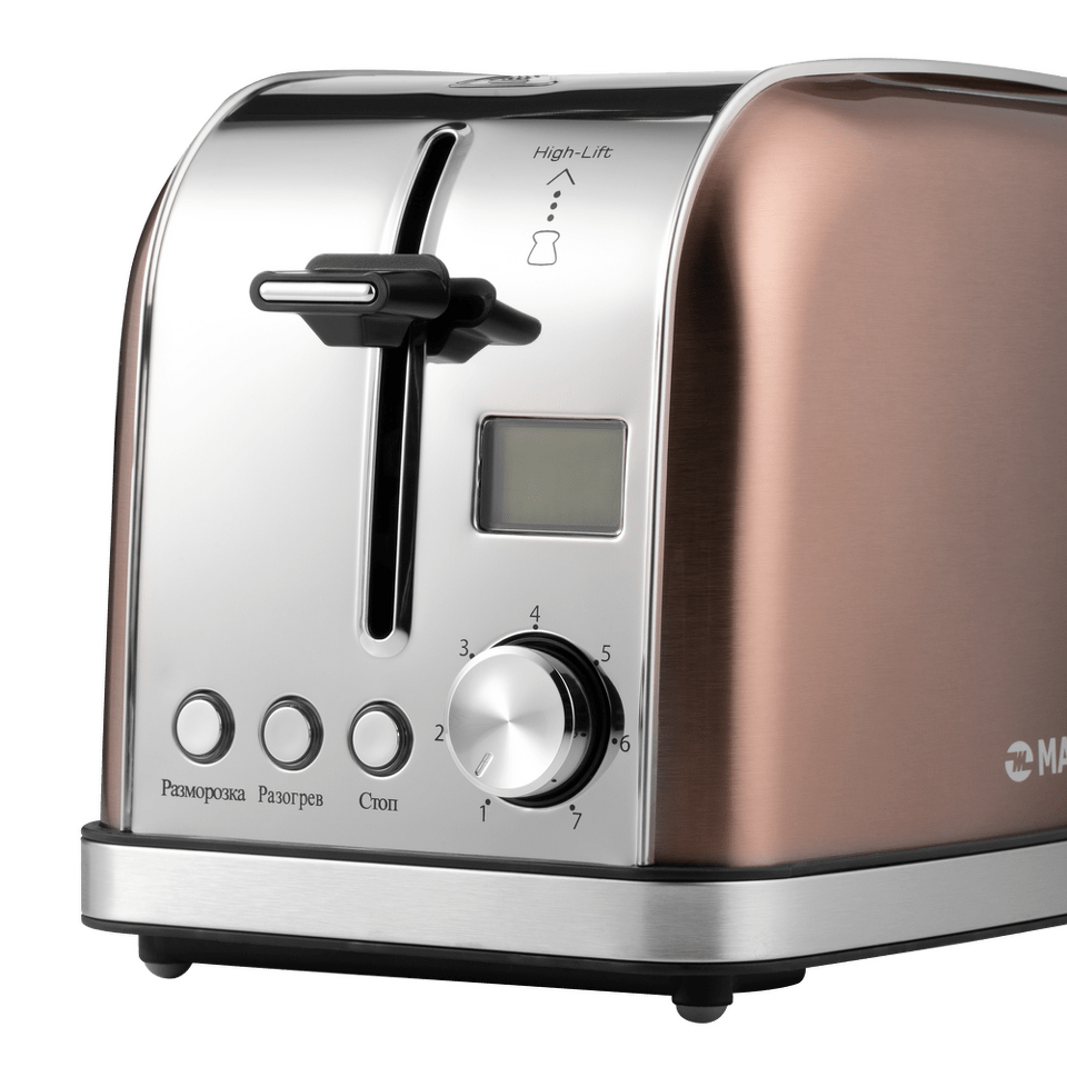 При приготовлении тостов с помощью регулятора выбираете одну из 7 возможных степеней обжарки, благодаря этому вы можете делать тосты из разных сортов хлеба (белого, зернового, черного и т.д.). Степень обжаривания отображается черточками на экране. Также на дисплее показывается обратный отсчет времени приготовления.