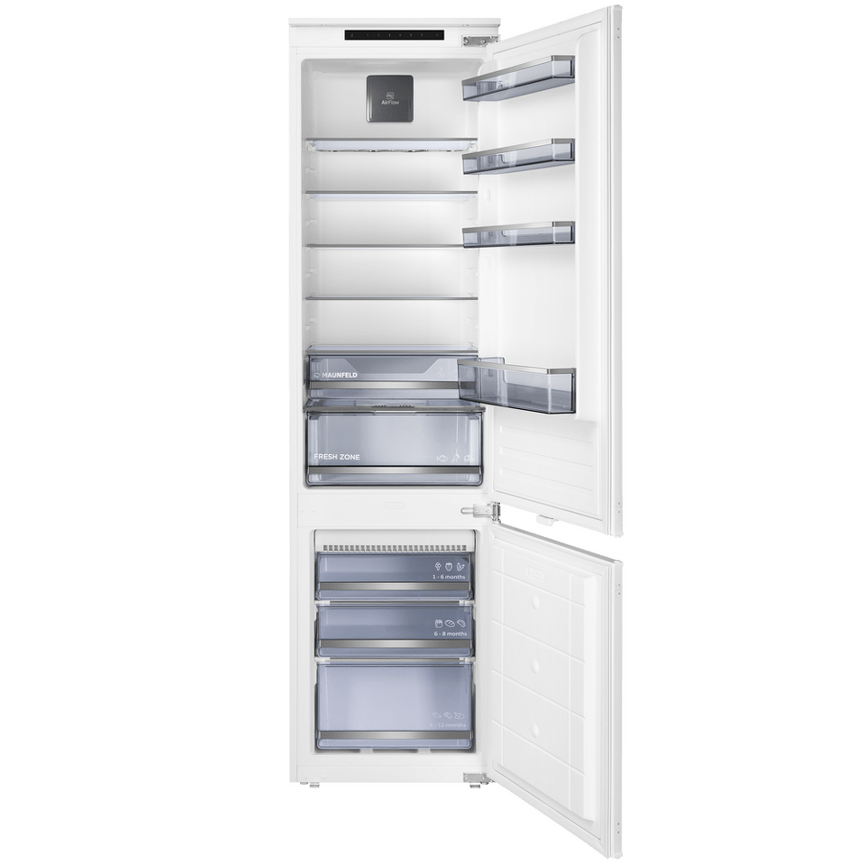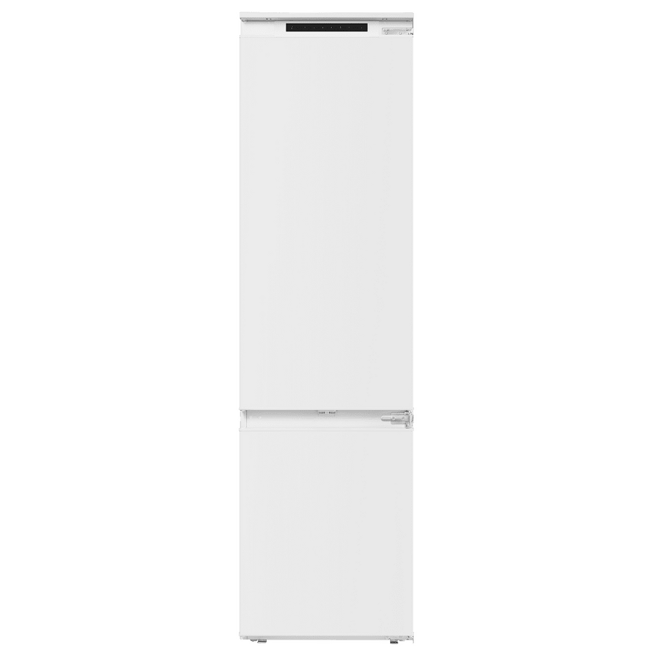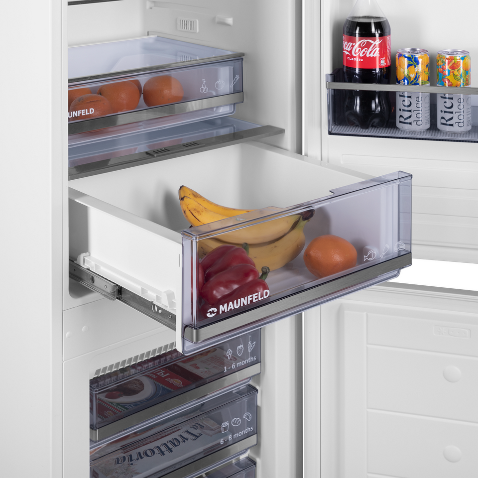 Высокий встраиваемый двухкамерный холодильник с системой NO FROST в морозильной камере, с инверторным компрессором и циркуляцией холодного воздуха AirFlow, электронным управлением, с двумя ящиками для овощей и фруктов на телескопических направляющих и тонированными выкатными ящиками и полками с металлизированной отделкой