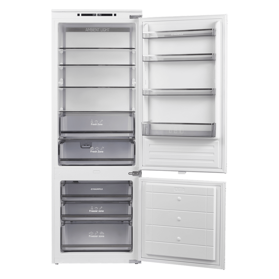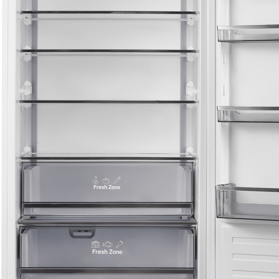 Встраиваемый двухкамерный холодильник шириной 69 см и высотой 193 см TOTAL NO FROST с инверторным компрессором и многопоточным охлаждением, с большой светящейся LED панелью на задней стенке и широкой сенсорной панелью управления, зоной свежести Fresh Zone и тонированными выкатными ящиками с металлизированной отделкой