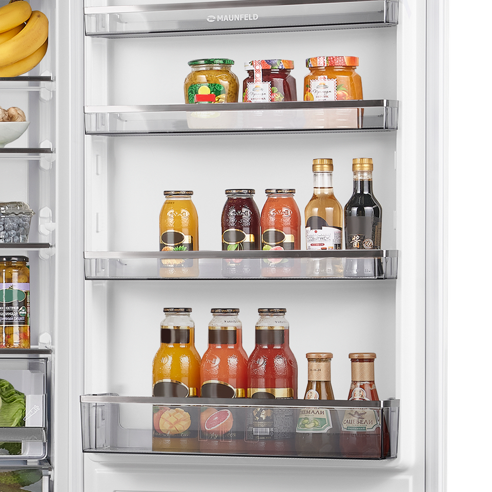 Храните больше продуктов в дверных карманах, не тратя пространство внутри полок. Широкие и глубокие дверные карманы позволят безопасно хранить больше бутылок, картонных пакетов и других объектов в постоянном доступе без необходимости брать их с полки.