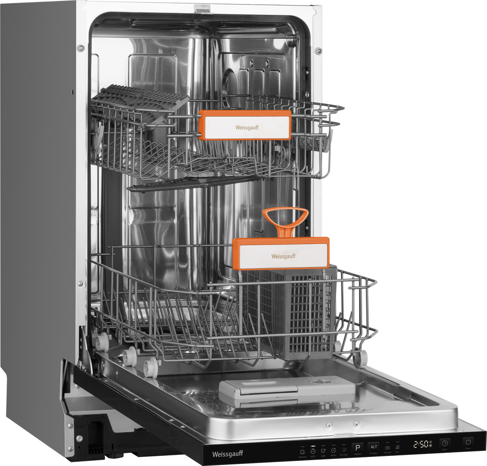 До 9 комплектов посуды одновременно вы можете расположить в данной посудомоечной машине, благодаря современным продуманным и эргономичным корзинам, которыми Weissgauff оснастили эту модель!