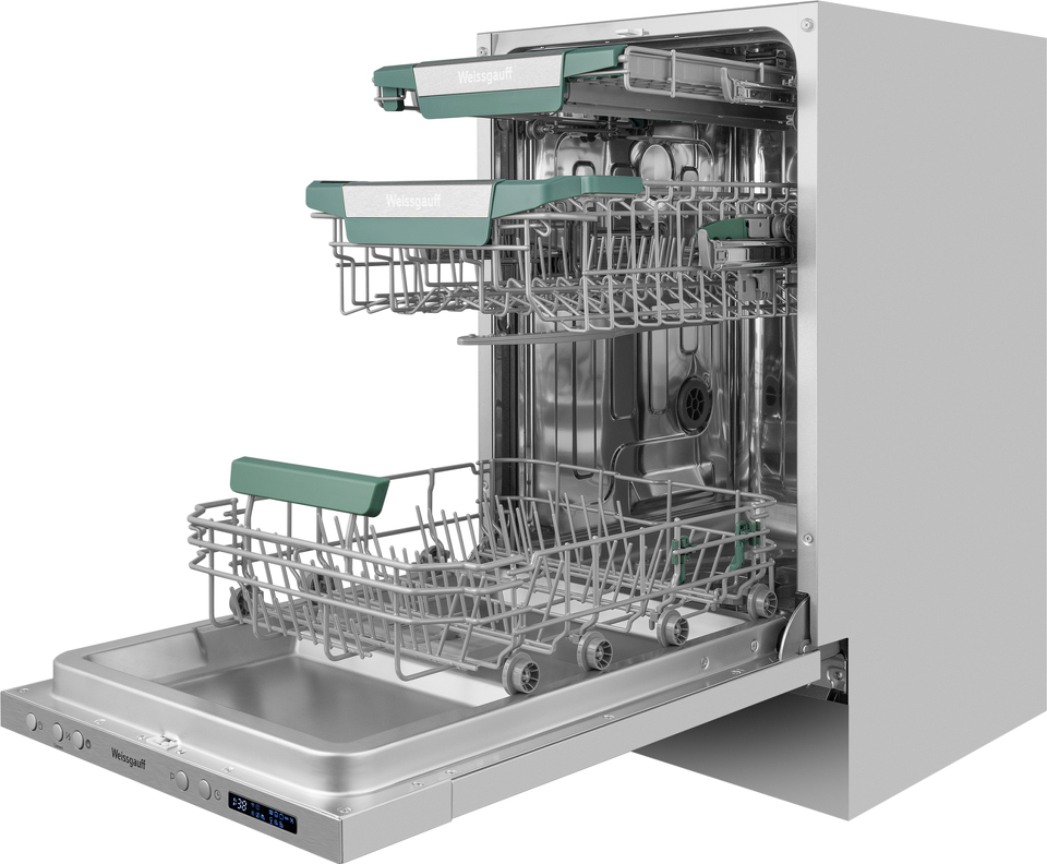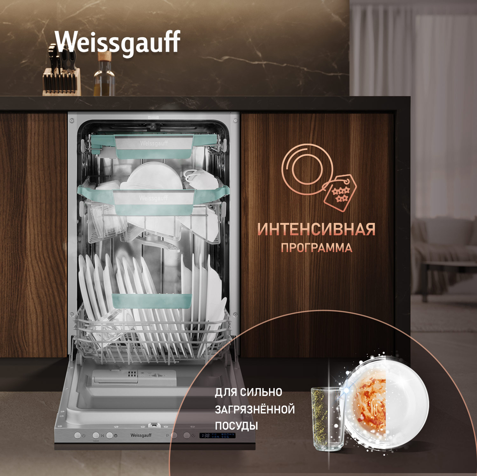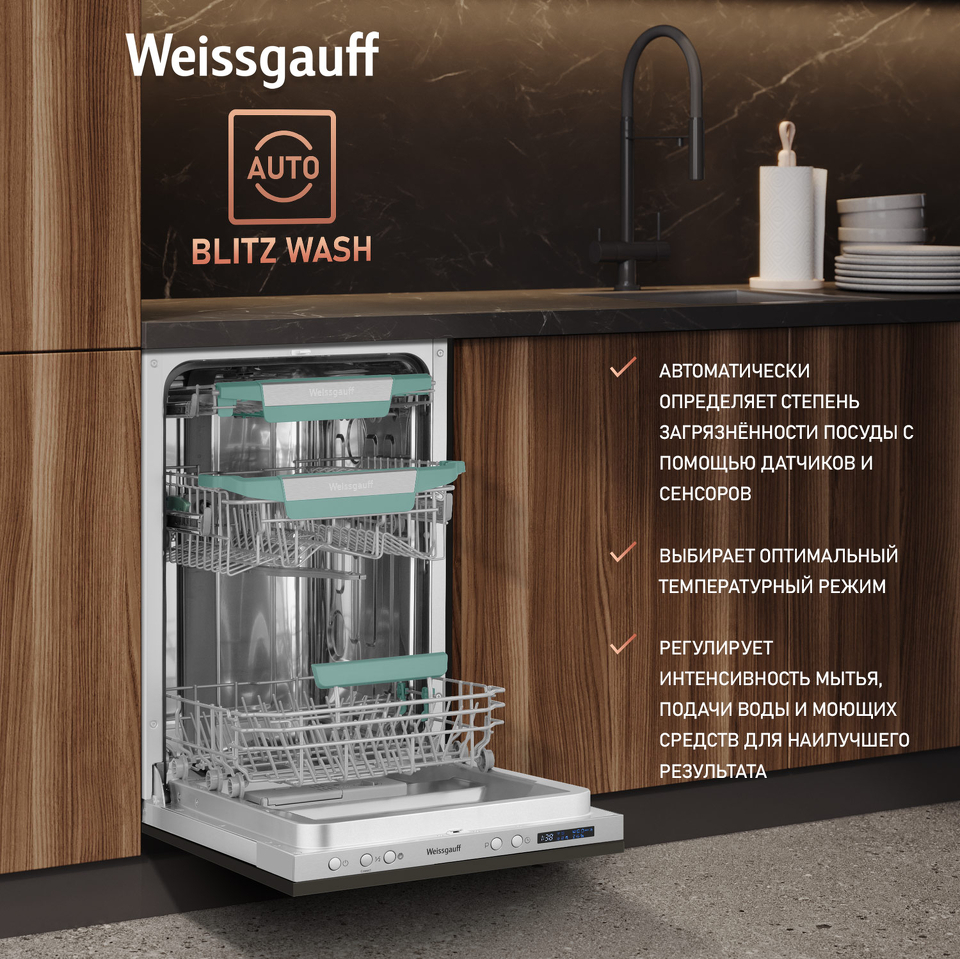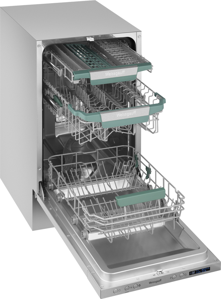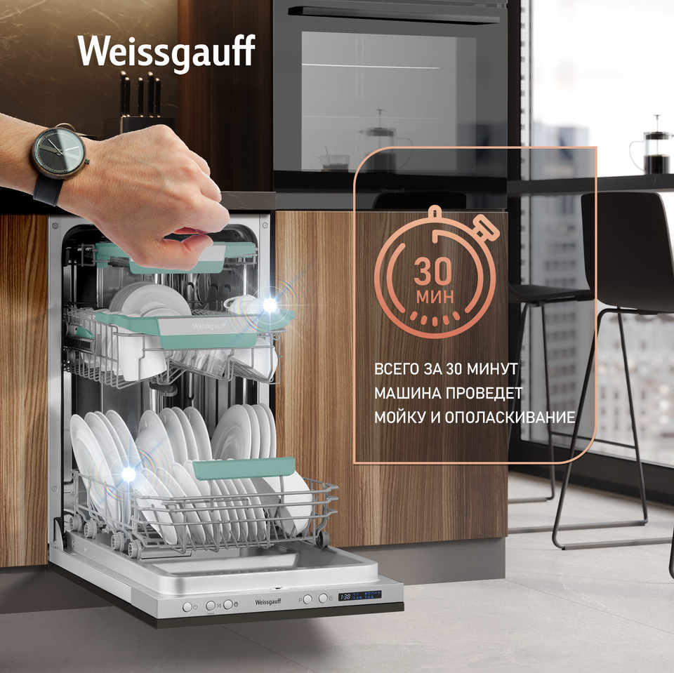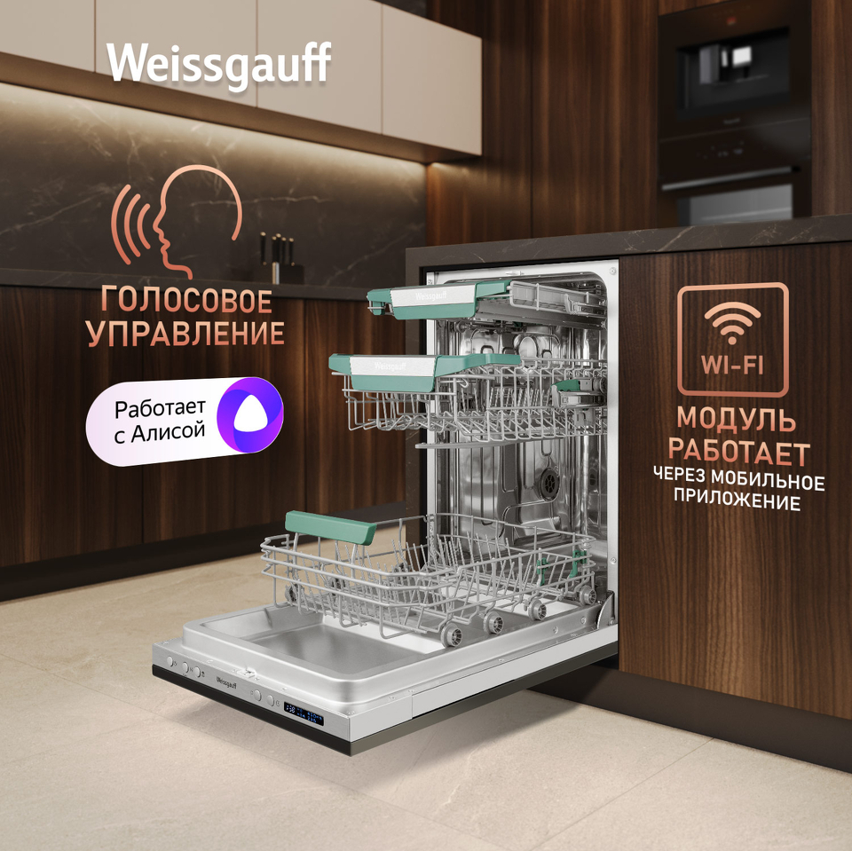 Узкая посудомоечная машина Weissgauff, оснащенная модулем Wi-Fi управления, не только сэкономит место на вашей кухне, но и обеспечит идеальный результат: 3 корзины позволят расположить посуду оптимальным образом для достижения наилучшего качества мытья а наличие автопрограммы позволит машине самостоятельно определить количество посуды, степень загрязнения, время мойки, а также необходимую температуру.