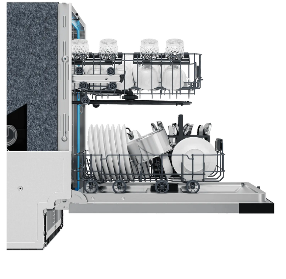 Встраиваемая посудомоечная машина шириной 60 см HDWE14-592RU рассчитана на загрузку до 14 стандартных комплектов посуды, такая большая вместимость поможет помыть за один цикл всю посуду практически в любой жизненной ситуации, причем в нижней и средней корзине есть складные держатели для тарелок. В нижней корзине есть складные держатели для тарелок, а верхнюю корзину можно отрегулировать по высоте, чтобы максимально удобно загрузить всю посуду. Важная особенность этой модели — автоматическое открывание двери в конце программы мойки. Так посуда высохнет более быстро и качественно без дополнительного расхода электроэнергии.