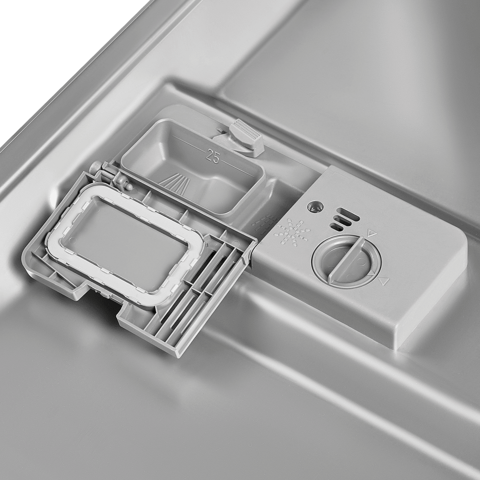 Полноразмерная посудомоечная машина шириной 60 см с лучом на полу. Высокая эффективность использования внутреннего пространства благодаря специальным корзинам.