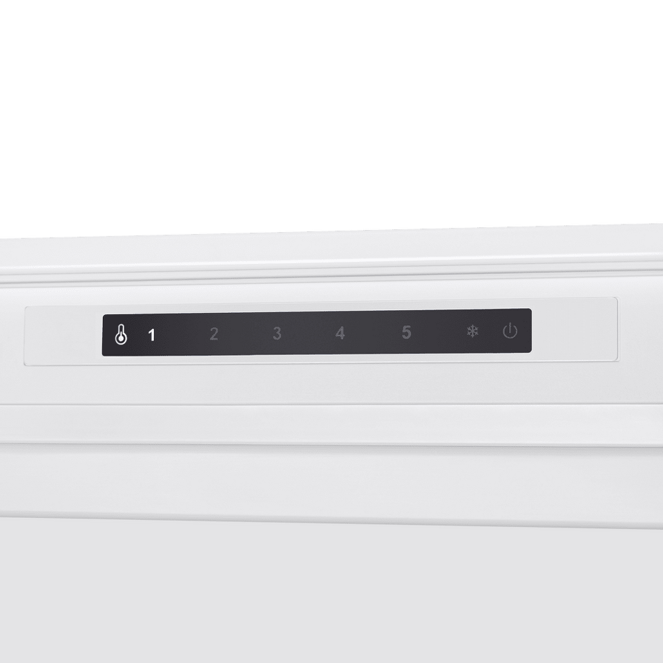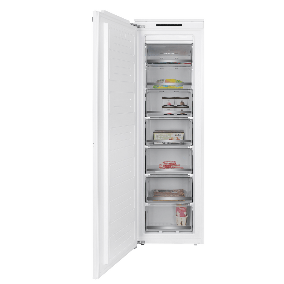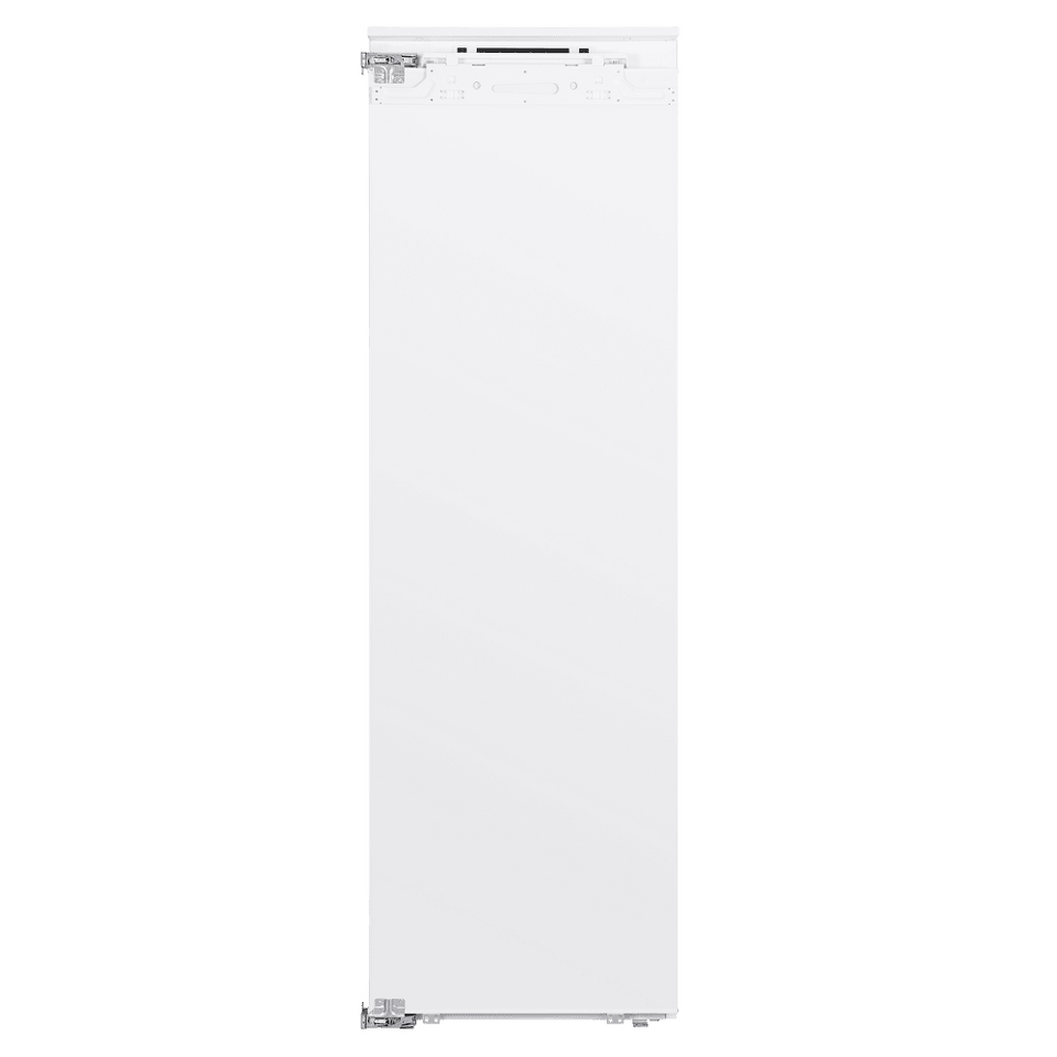 Современный встраиваемый морозильник высотой 177 см и объемом 203 л. Корпус шириной 54 см сделан из металла.