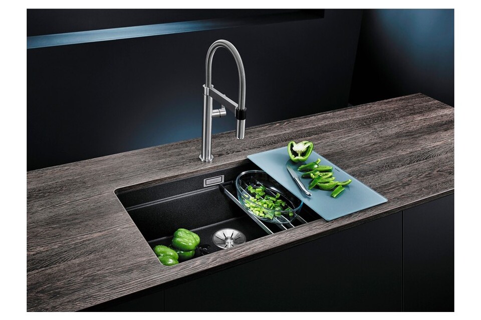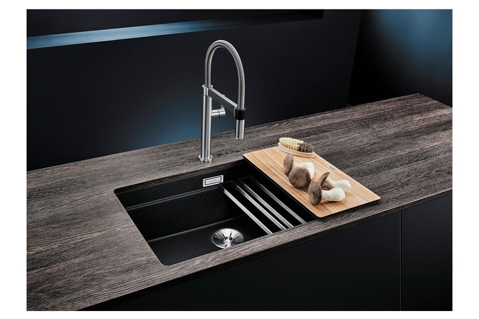 Чаша Etagon имеет небольшие выступы по бокам, о которые невозможно удариться. При этом они служат опорой для двух входящих в комплект держателя. Они могут раздвигаться, но не скользят, поэтому надёжно фиксируют утварь. С ними можно слить воду в дуршлаге, дождаться высыхания чашек и тарелок или же установить на них разделочную доску, с которой всё будет смахиваться в чашу. Надёжная отводная арматура InFino может быть дополнена клапаном — автоматом, который задержит или сольёт воду в раковине.