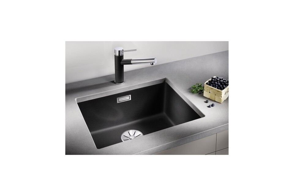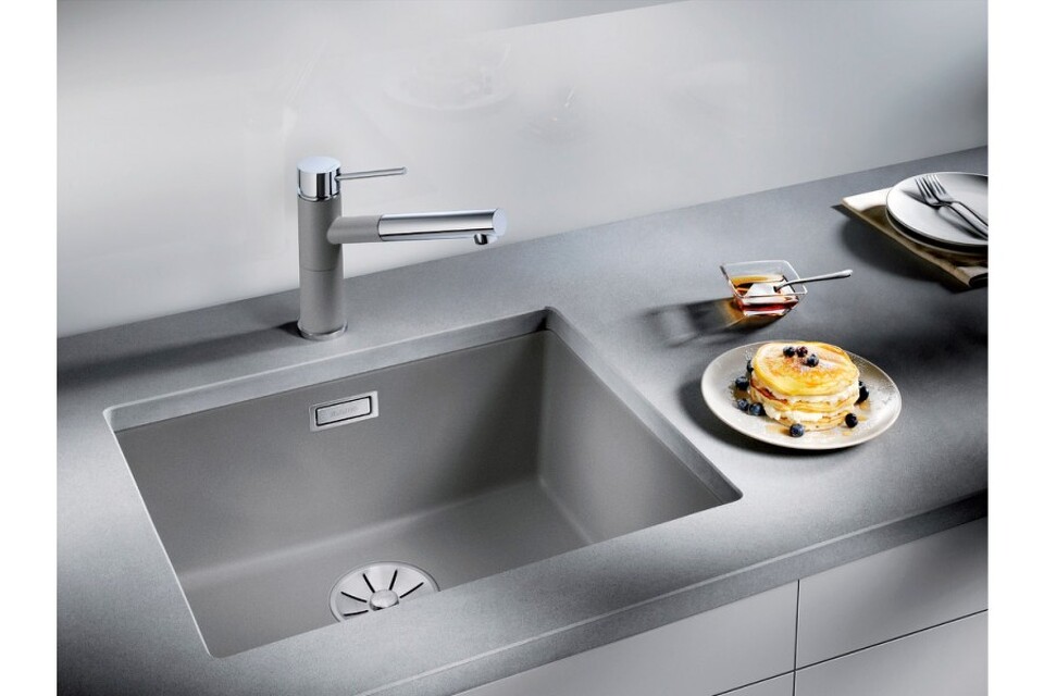 Данная модель лишена крыла, поэтому не заберёт рабочую поверхность, что немаловажно. При этом монтаж мойки Blanco SUBLINE 500-U SILGRANIT отводная арматура InFino осуществляется под столешницу. Значит, если вода будет попадать на поверхность рядом, то она будет скатываться прямо в раковину, без лишнего барьера. Кроме того, такой способ установки визуально чище.