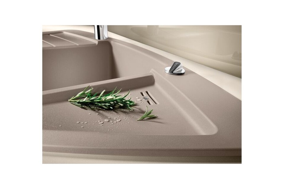 Бланко Zia 9E имеет достаточно глубокую чашу — 18 см. Материал Silgranit прекрасно глушит воду, при этом обладает грязеотталкивающими свойствами и инертен к агрессивным химическим веществам — кислотам, уксусу, пищевым красителям. Мойка выдерживает температуры до 280̊С, поэтому можно ставить на крылья горячую посуду, сливать кипяток, размораживать продукты. Поверхность не царапается и не крошится со временем, на крыльях удобно резать овощи, разделывать мясо.