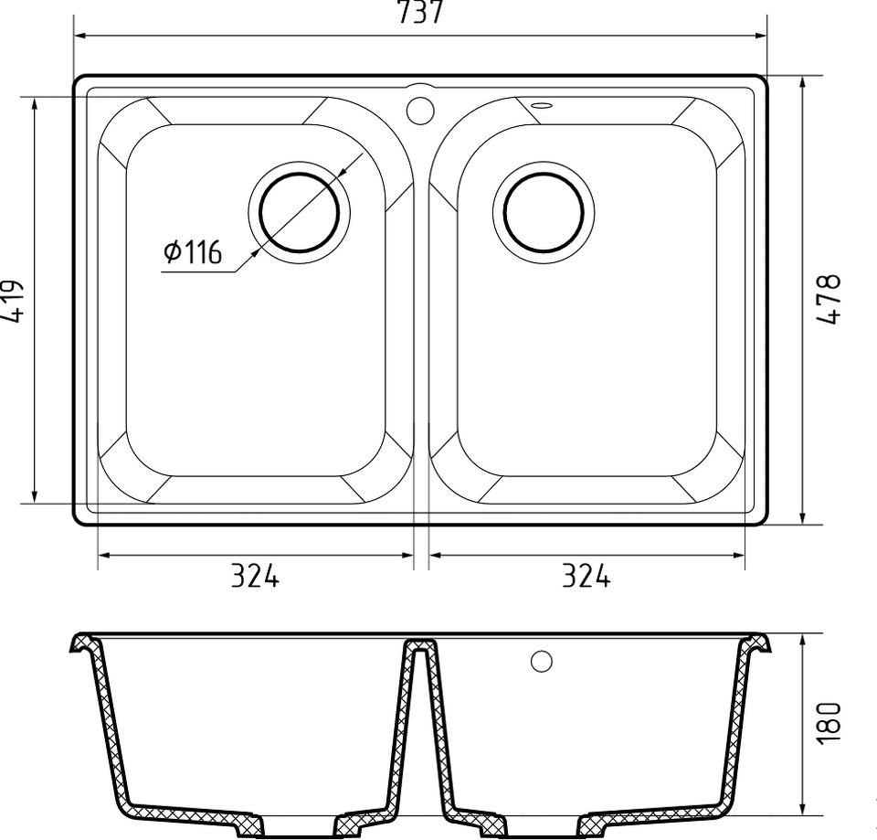 Глубина основной чаши, мм 180