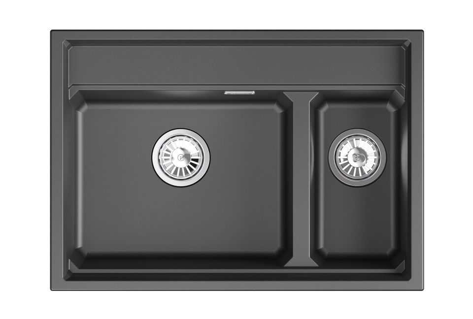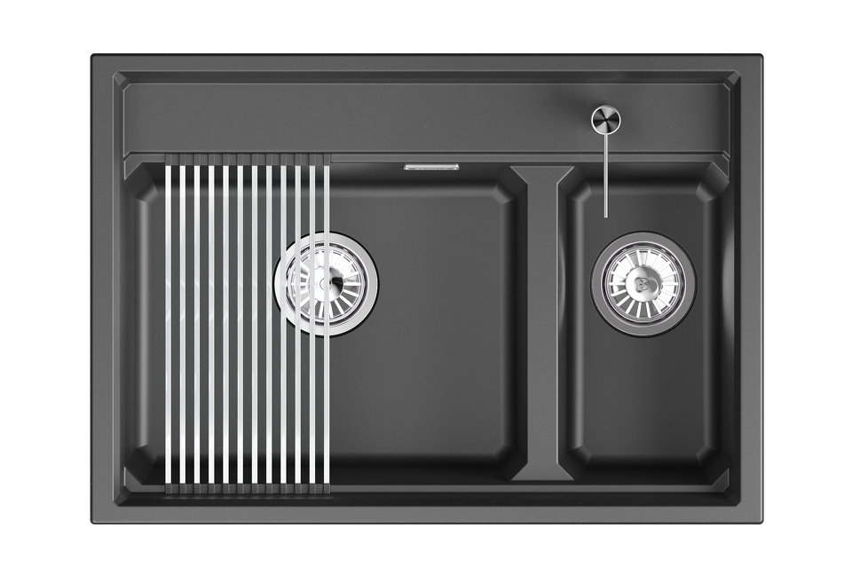 Мойка Granula с двумя чашами - идеальное решение для эффективной работы на кухне! Широкая чаша для мытья большой посуды, узкая чаша - для ополаскивания и мойки фруктов, овощей и мелкой посуды. Материал - кварцевый песок, прочный и износостойкий. Форма чаши адаптирована под функциональный ролл-мат. Мойка легко моется и устойчива к высоким температурам. В комплекте: ролл-мат, дозатор жидкого мыла, сифон.