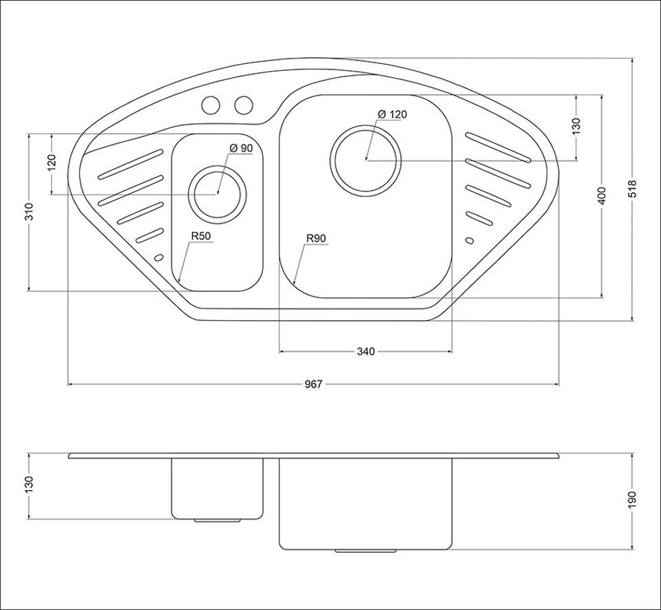 Размер сливного отверстия: 120 мм (большая чаша) и 90 мм (маленькая чаша)