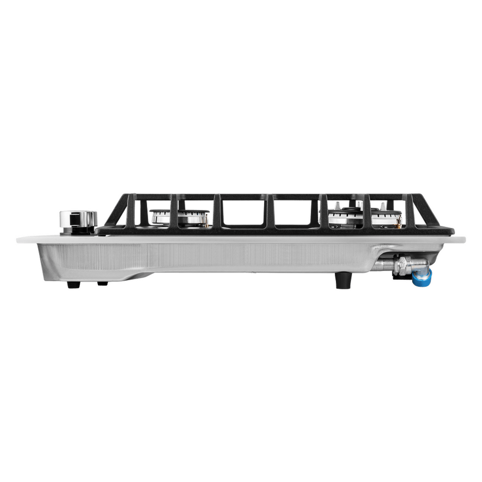 Панель белого цвета выполнена из закаленного стекла толщиной 8 мм от немецкого производителя Schott. В данной модели установлены высококачественные итальянские горелки «Sabaf». Одна стандартная конфорка  мощностью 1700 Вт и одна WOK-конфорка с двойным пламенем  мощностью 3000 Вт.