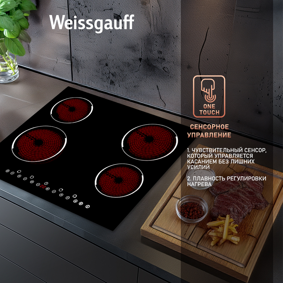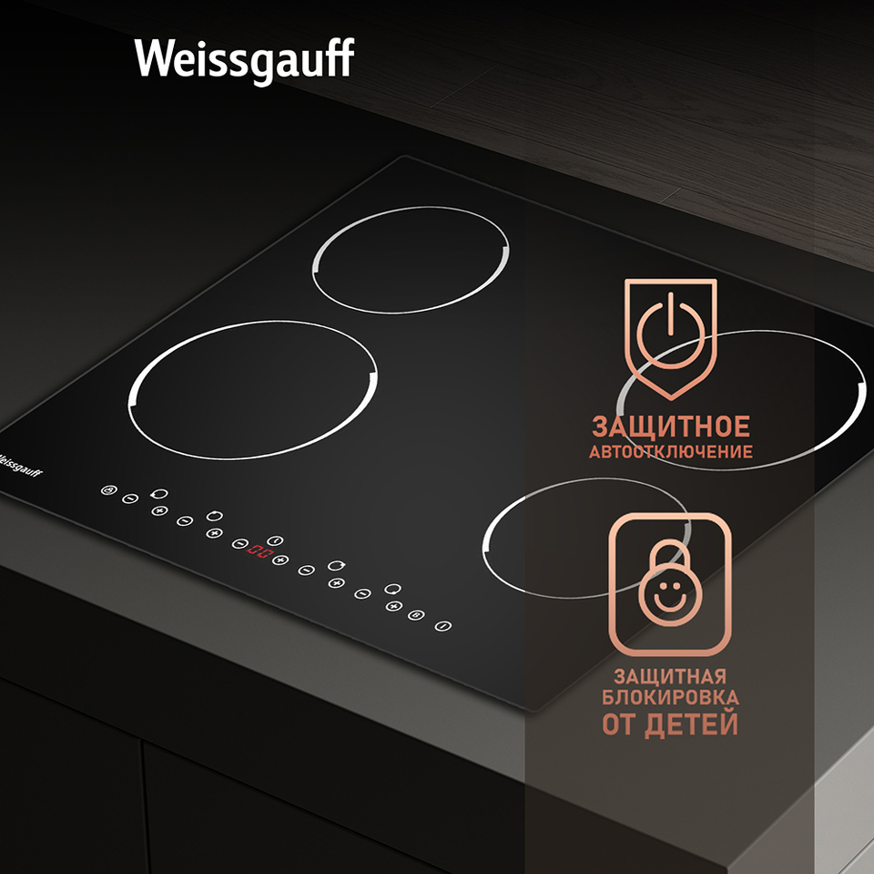 Стеклокерамическая варочная панель Weissgauff с особым дизайном конфорок Glide-Zone гармонично впишется в интерьер вашей кухни, а чувствительное сенсорное управление позволит всего в одно касание задать необходимый уровень нагрева для любой из конфорок.