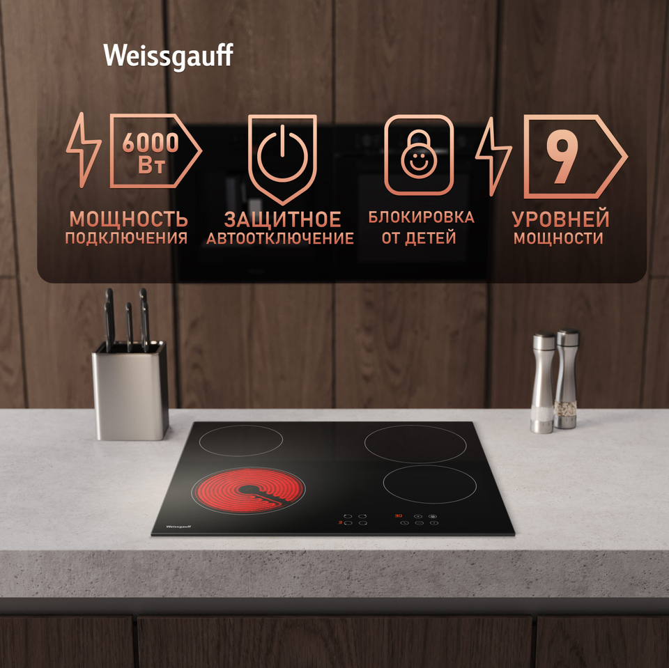 Стеклокерамическая варочная панель Weissgauff c 4 эффективными конфорками гармонично впишется в интерьер вашей кухни, а чувствительное сенсорное управление позволит всего в одно касание задать необходимый уровень нагрева для любой из конфорок.