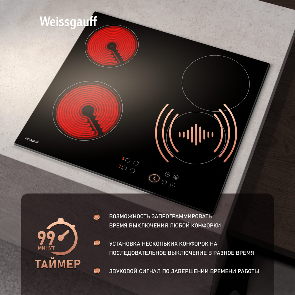 Таймер до 99 минут дает вам возможность запрограммировать время выключения любой конфорки, с точностью до минуты