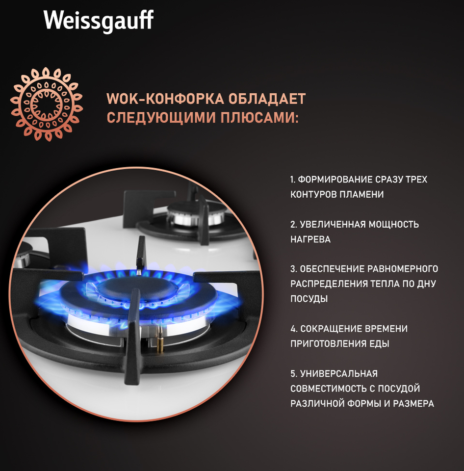 WOK-конфорка имеет два ряда пламени, что позволяет использовать посуду большого объёма и приготовить еду, экономя тем самым время, газ и сохраняя при этом максимум полезных веществ в продуктах!