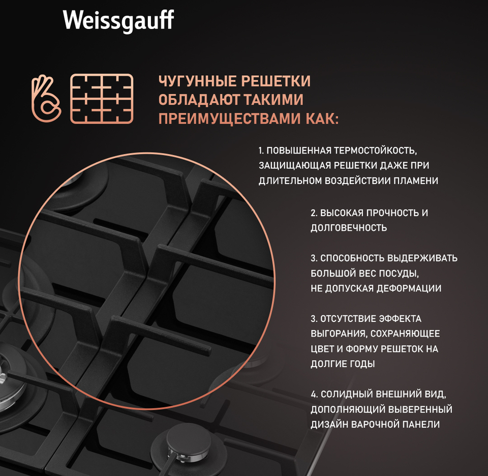 • Решетки из высококачественного чугуна это неизменное качество, надежность и долговечность, воплощенные в каждой детали! Благодаря особому строению цельных решеток Weissgauff, размещение посуды на них становится ещё более удобным и устойчивым!