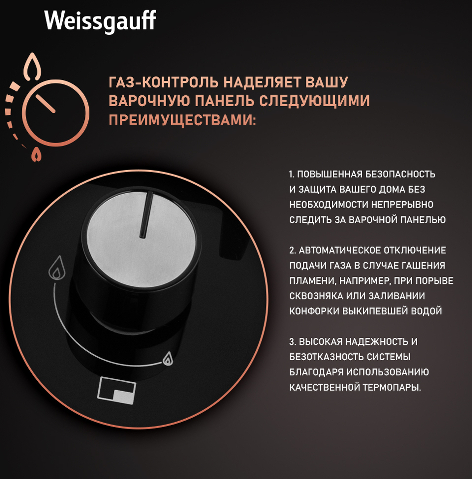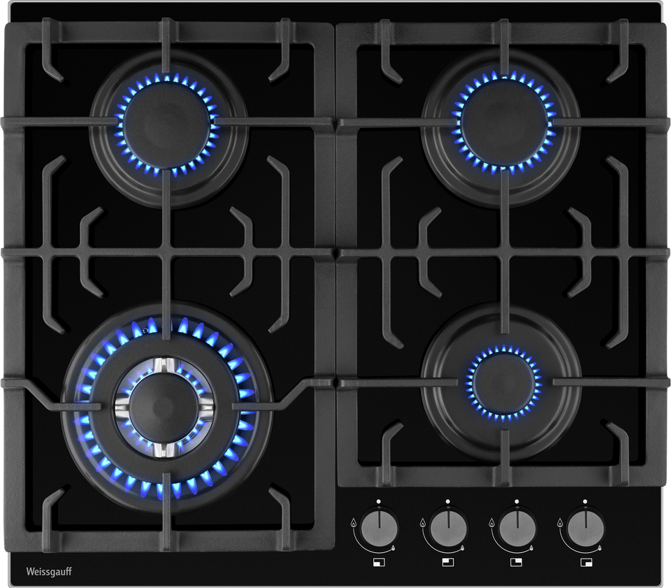 Встраиваемая независимая газовая панель Weissgauff шириной 60 см, исполненная в закалённом чёрном стекле - это стильное и компактное решение для вашей кухни!