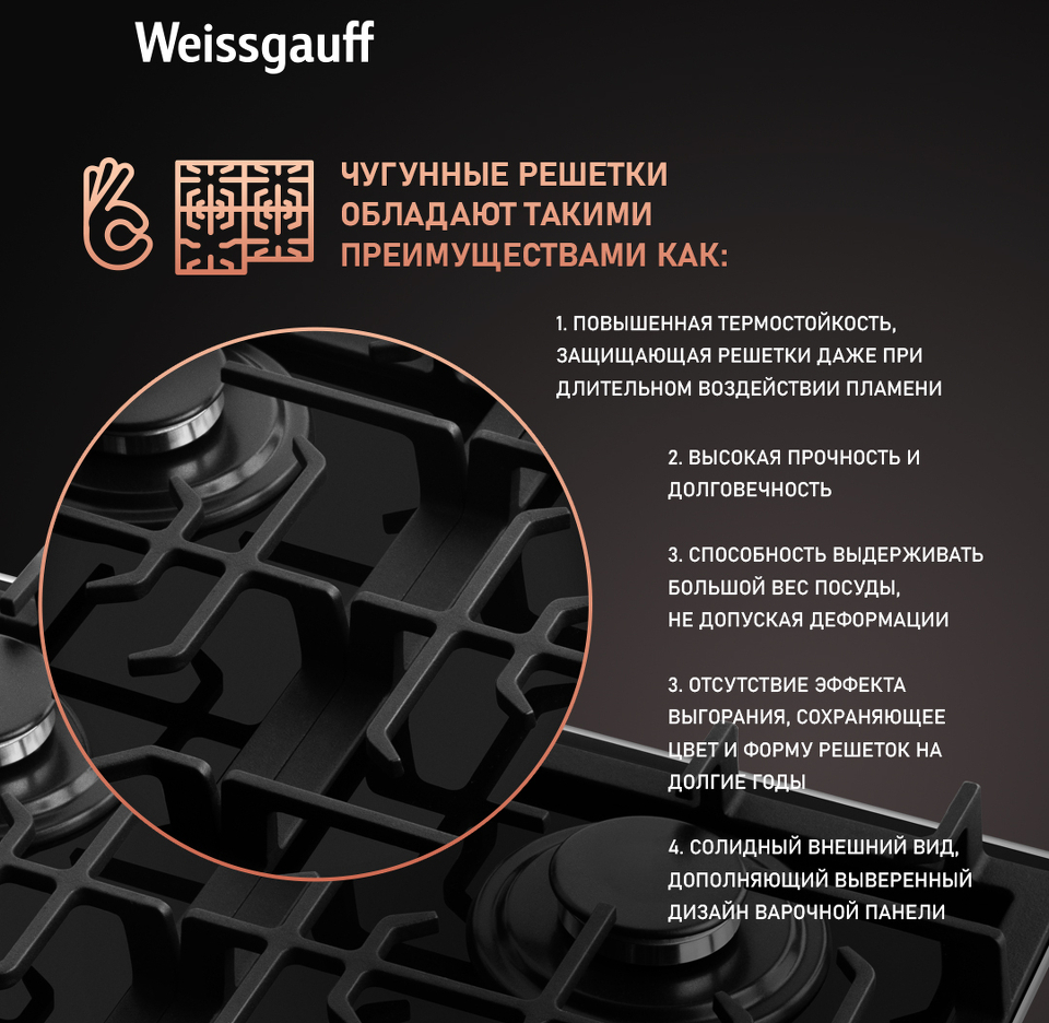 • Решетки из высококачественного чугуна это неизменное качество, надежность и долговечность, воплощенные в каждой детали! А особая элегантность их дизайна не только послужит отличным дополнением к общему стилю варочной панели, но и существенно облегчит очистку и уход за ней. А благодаря особому вниманию Weissgauff к каждой детали, вы еще не раз оцените устойчивость и эргономичность этих решеток!