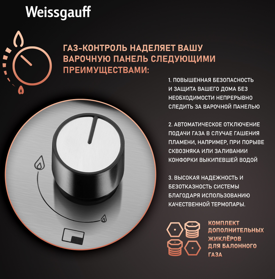 Новое поколение встраиваемых независимых газовых панелей Weissgauff представляет модель шириной 60 см, оснащенную 4 эффективными конфорками (в том числе и WOK-конфорку с трехконтурным пламенем), решетками из высококачественного чугуна, функцией автоматического электроподжига и системой безопасности "газ-контроль". Дизайн, исполненный в нержавеющей стали, дополнит безупречный облик модели, сделав её не только практичным решением для приготовления любого блюда, но и настоящей жемчужиной в интерьере вашей кухни!