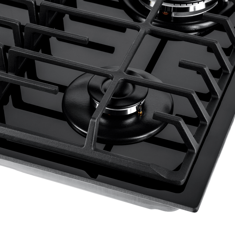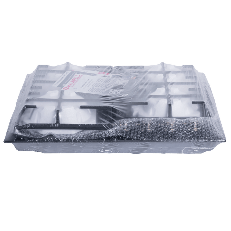 Сплошное крестообразное соединение над всеми конфорками, позволяет использовать посуду любого диаметра, и теперь нет необходимости покупать специальные подставки.