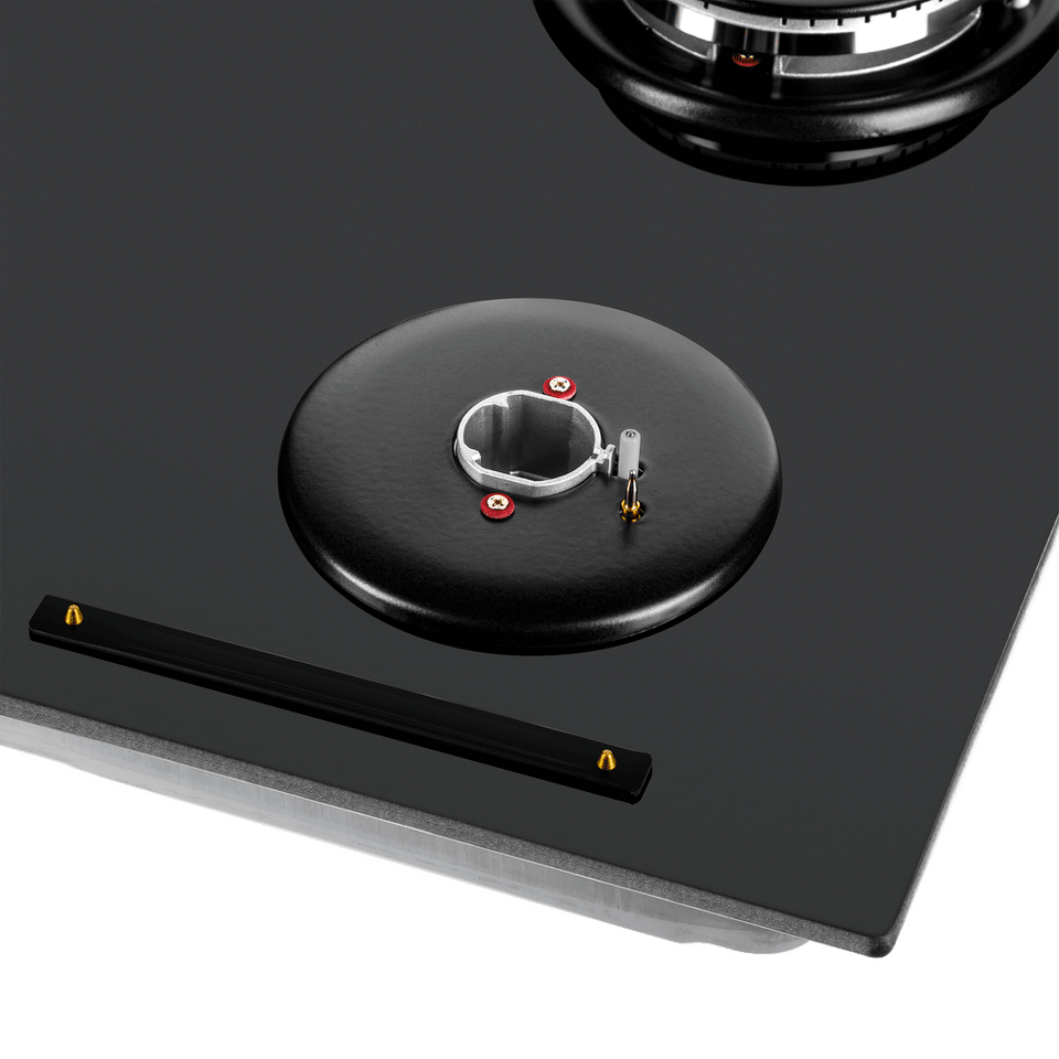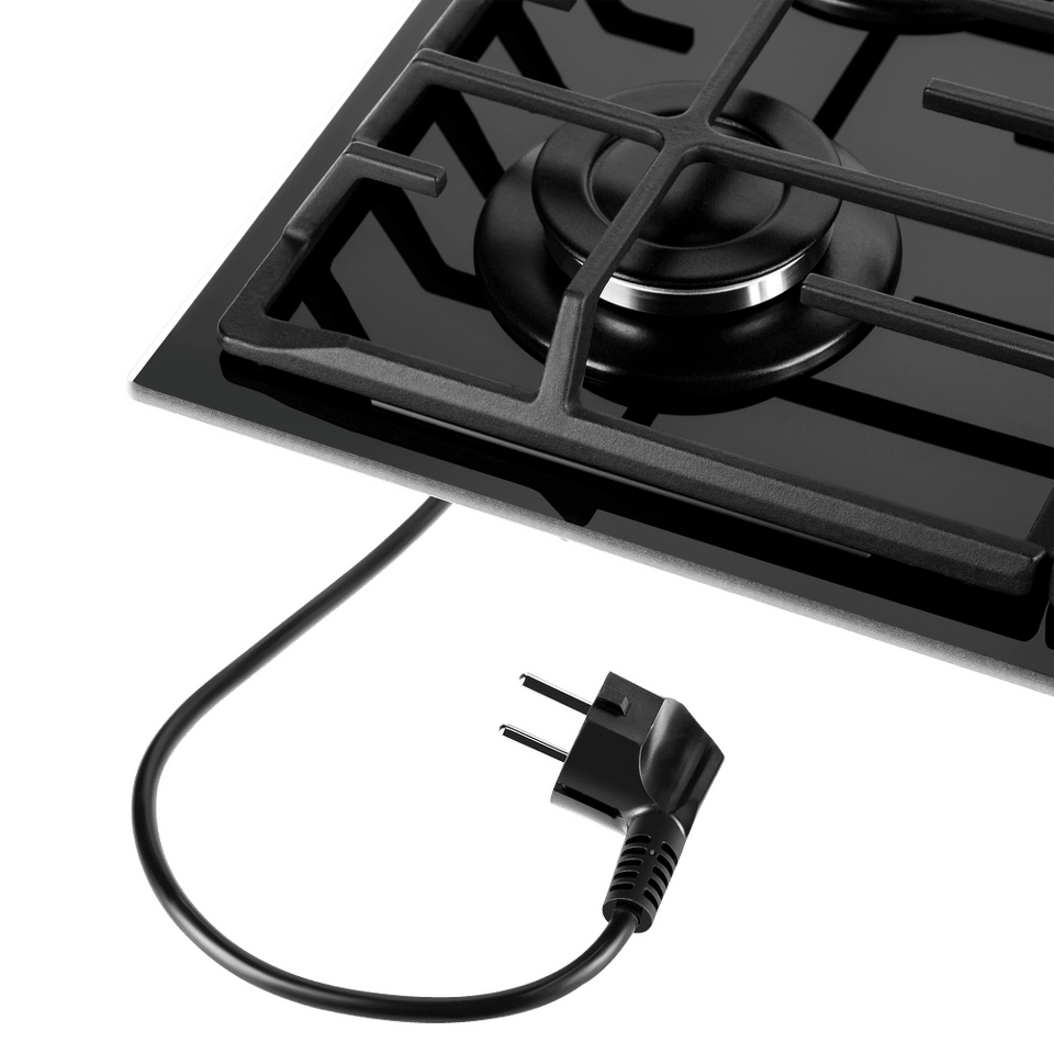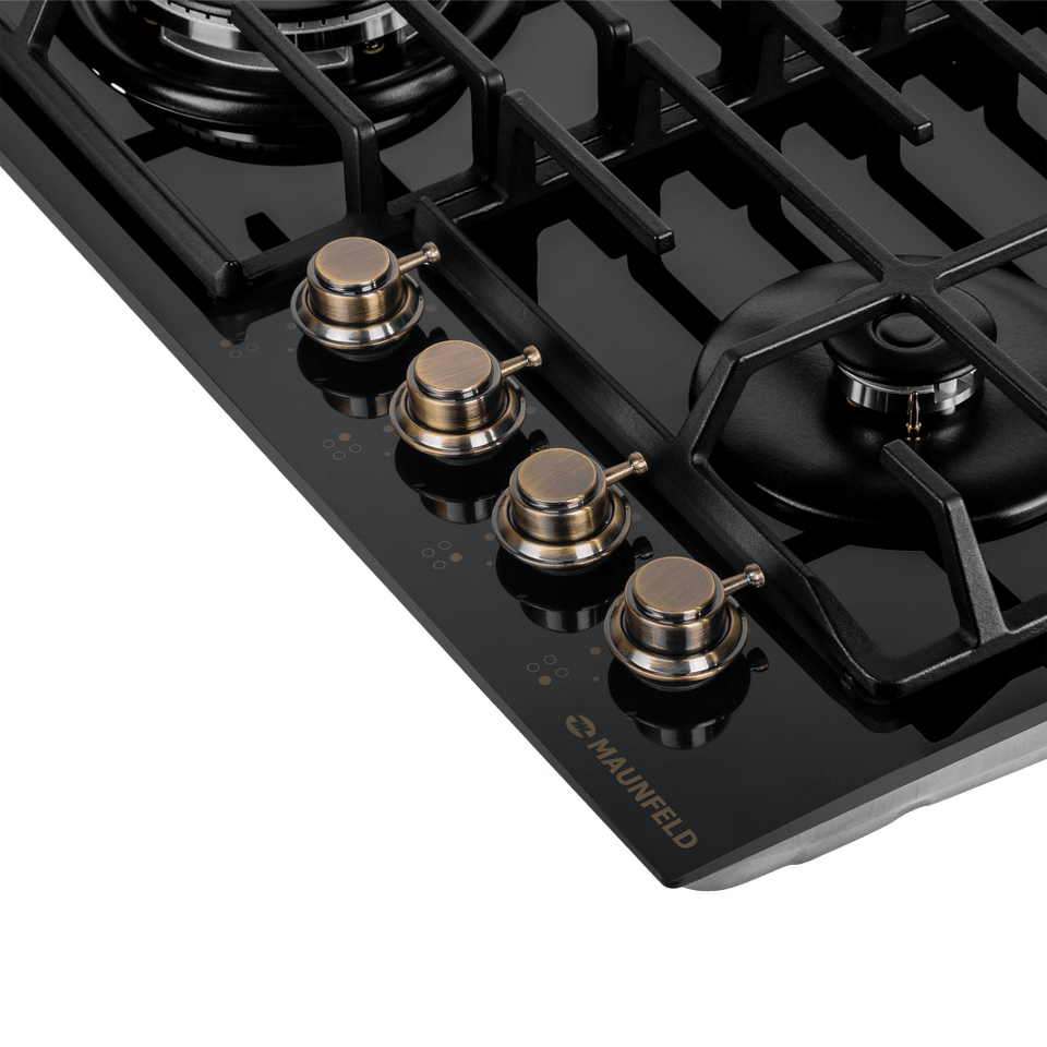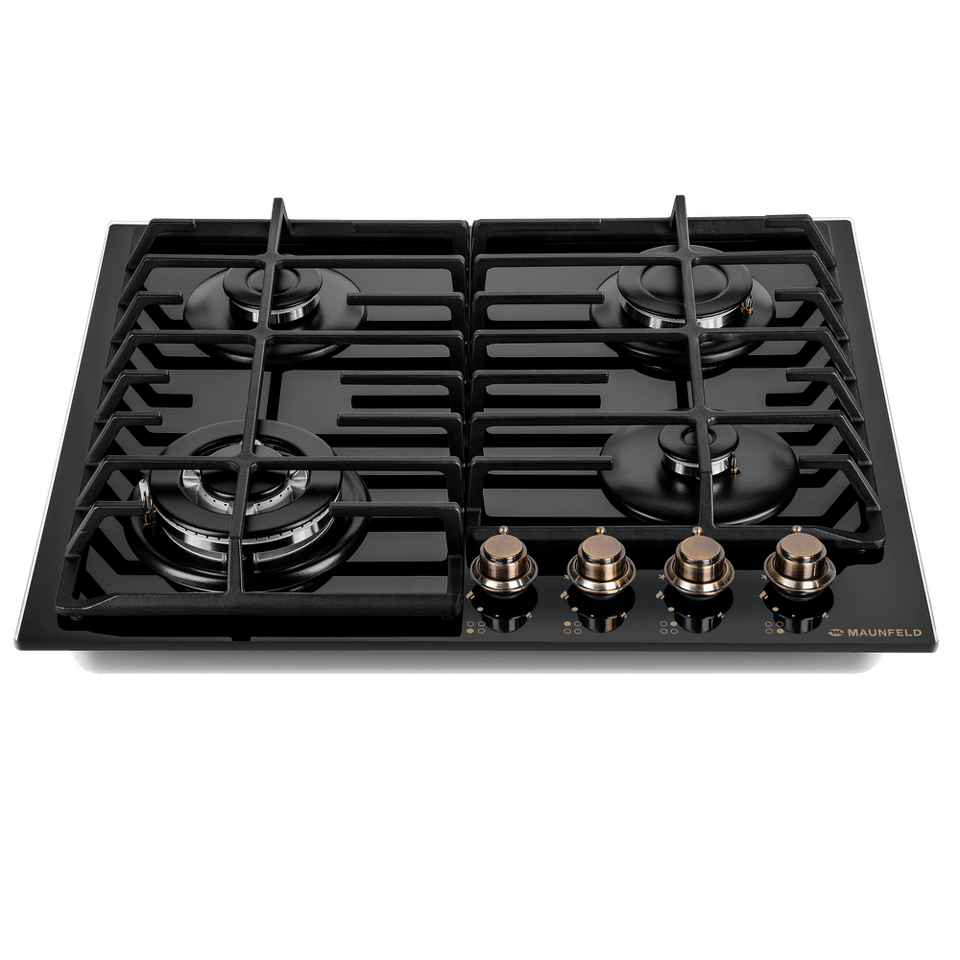 Панель выполнена из закаленного стекла, устойчивого к царапинам, сколам и постоянным перепадам температур. В данной модели установлены высококачественные итальянские горелки SABAF. Три стандартные конфорки мощностью 1000 Вт, 1700 Вт, 2600 Вт и одна сверхмощная WOK-конфорка с двойным пламенем мощностью 3800 Вт спроектированы таким образом, что огонь не перегревает ни чугунные решетки, ни ручки управления.
