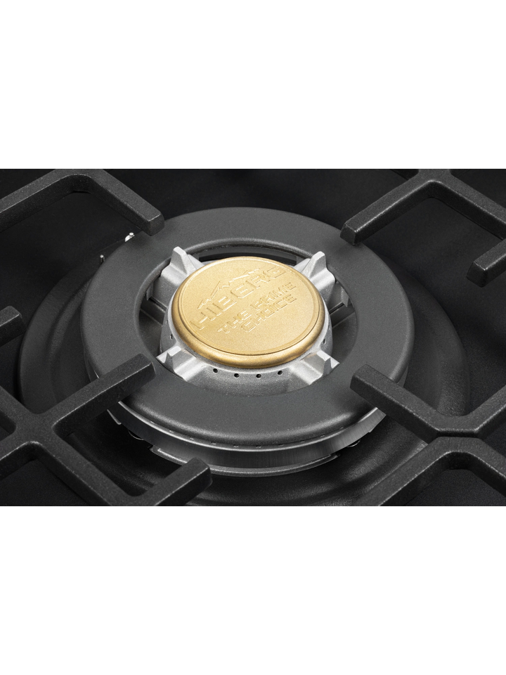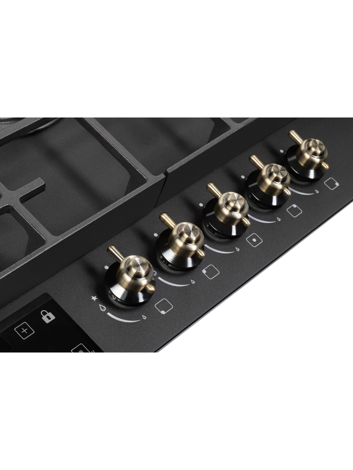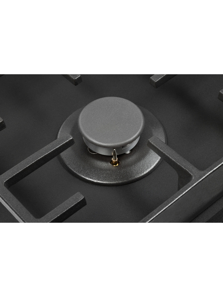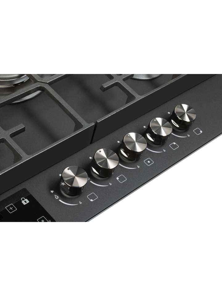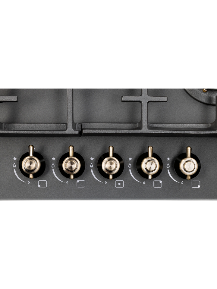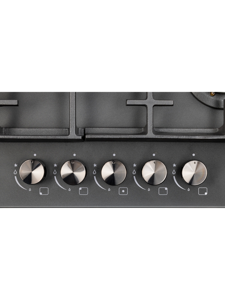 Пять конфорок черной газовой варочной панели отличаются диаметром и мощностью. Дополнительная горелка позволяет готовить еще больше блюд одновременно. Самая большая конфорка – WOK с тройным рядом пламени и мощностью 3,4 кВт. Усиленный жар способен быстро нагреть толстостенную глубокую посуду с небольшим диаметром дна для приготовления азиатской кухни. Также на ней можно быстро вскипятить воду, ускорить процесс жарки мясных и рыбных блюд до хрустящей корочки при добавлении небольшого количества жира.