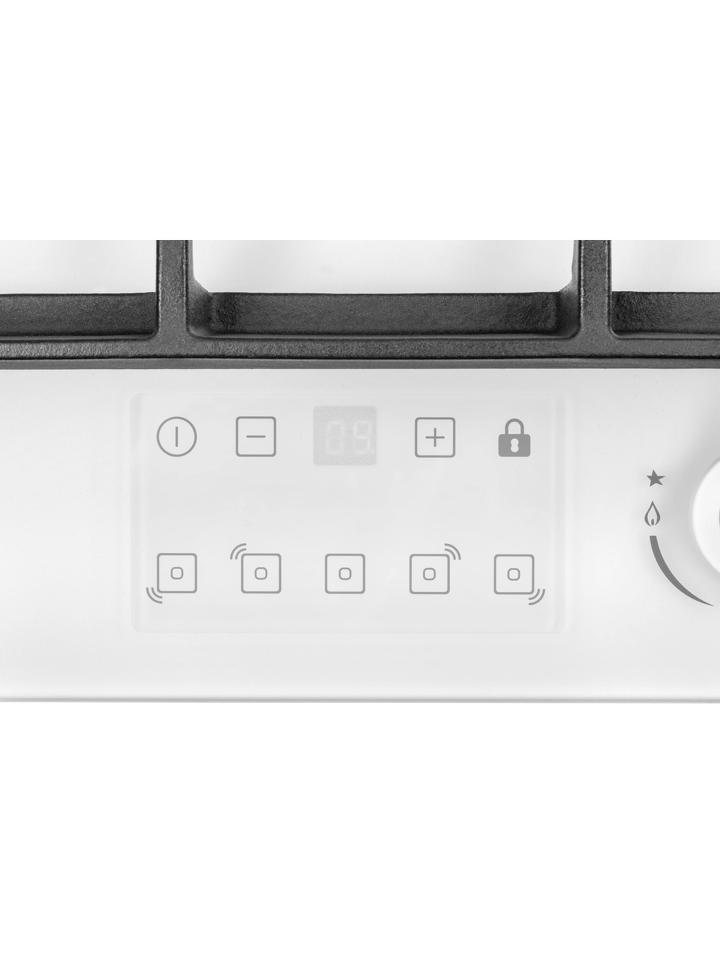 С помощью сенсорного таймера отключения газа можно контролировать время приготовления на нескольких конфорках сразу. Настройки устанавливаются с диапазоном от 1 до 99 минут. По истечении заданного времени конфорка отключается автоматически. При необходимости таймер можно выключить досрочно.