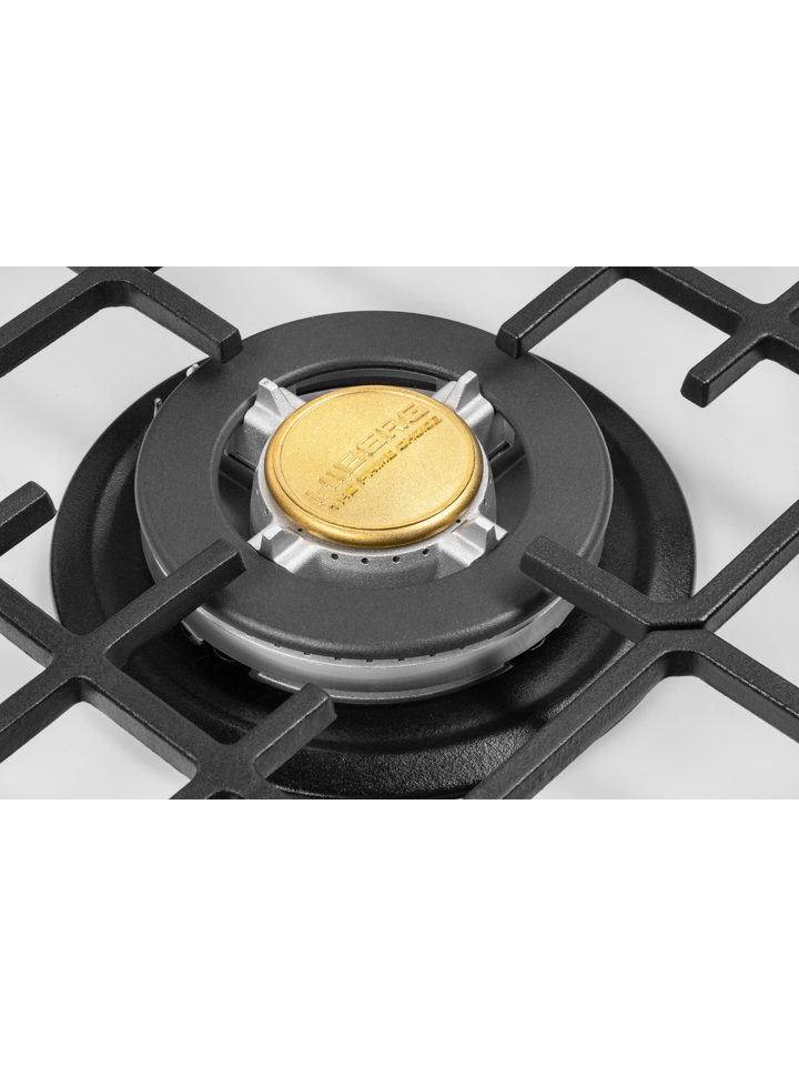 Пять конфорок газовой варочной панели отличаются диаметром и мощностью. Дополнительная горелка позволяет готовить еще больше блюд одновременно. Самая большая конфорка – WOK с тройным рядом пламени и мощностью 3,4 кВт. Усиленный жар способен быстро нагреть толстостенную глубокую посуду с небольшим диаметром дна для приготовления азиатской кухни. Также на ней можно быстро вскипятить воду, ускорить процесс жарки мясных и рыбных блюд до хрустящей корочки при добавлении небольшого количества жира.