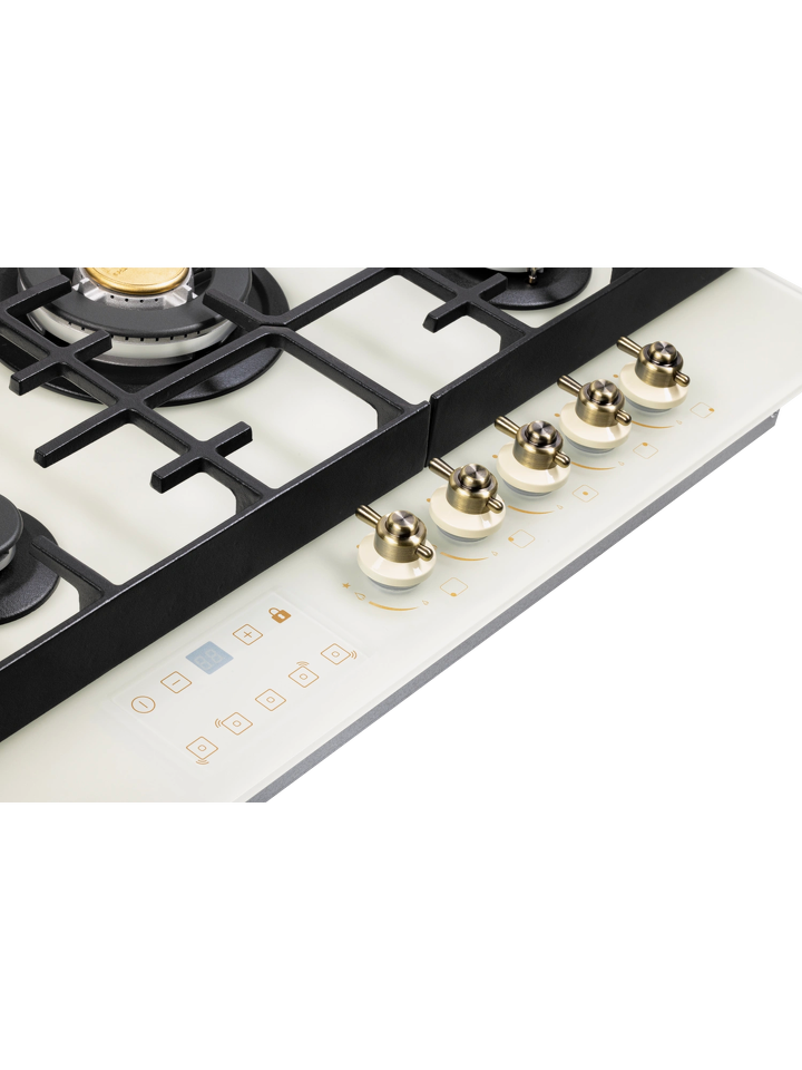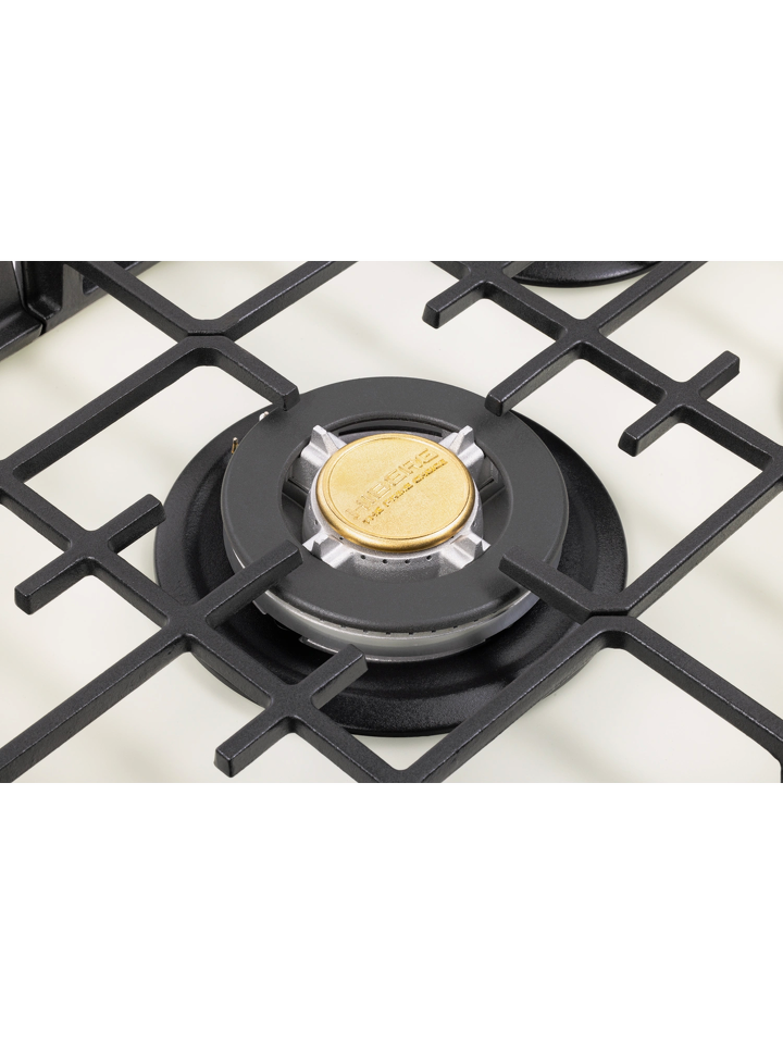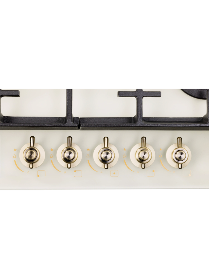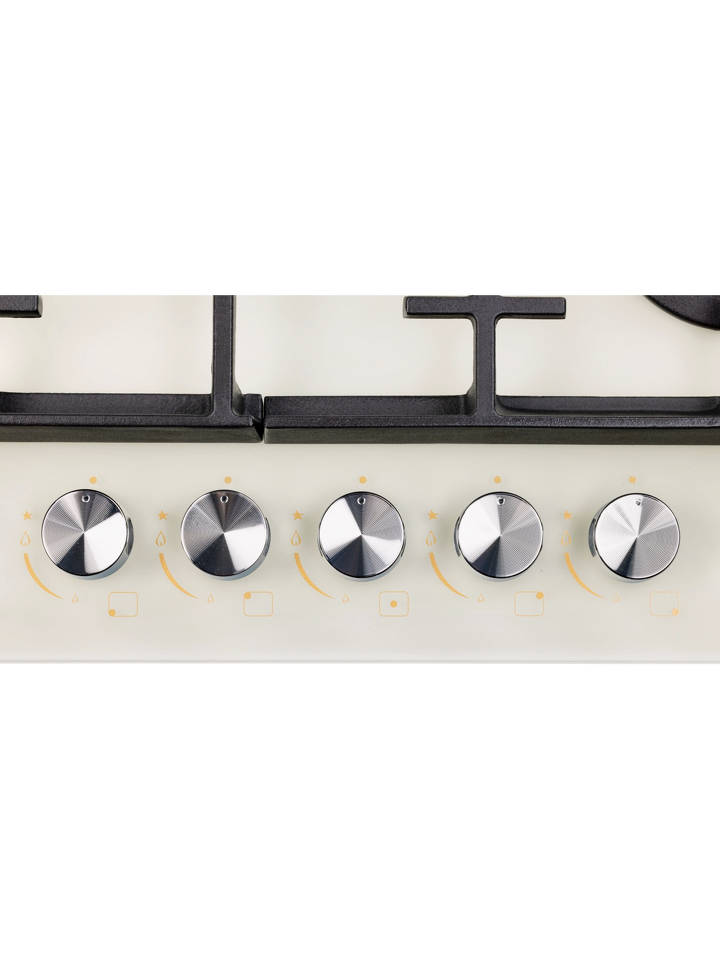Пять конфорок газовой варочной панели отличаются диаметром и мощностью. Дополнительная горелка позволяет готовить еще больше блюд одновременно. Самая большая конфорка – WOK с тройным рядом пламени и мощностью 3,4 кВт. Усиленный жар способен быстро нагреть толстостенную глубокую посуду с небольшим диаметром дна для приготовления азиатской кухни. Также на ней можно быстро вскипятить воду, ускорить процесс жарки мясных и рыбных блюд до хрустящей корочки при добавлении небольшого количества жира.