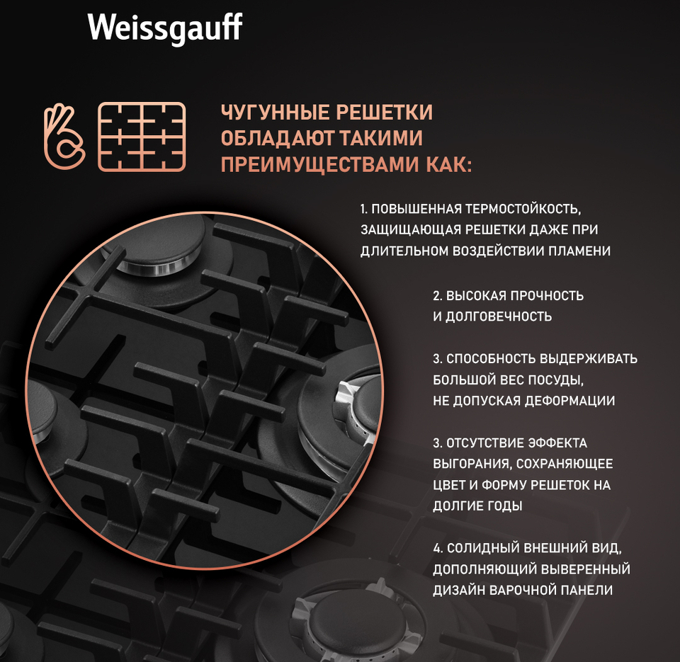 • Решетки из высококачественного чугуна это неизменное качество, надежность и долговечность, воплощенные в каждой детали! Благодаря особому строению цельных решеток Weissgauff, размещение посуды на них становится ещё более удобным и устойчивым!