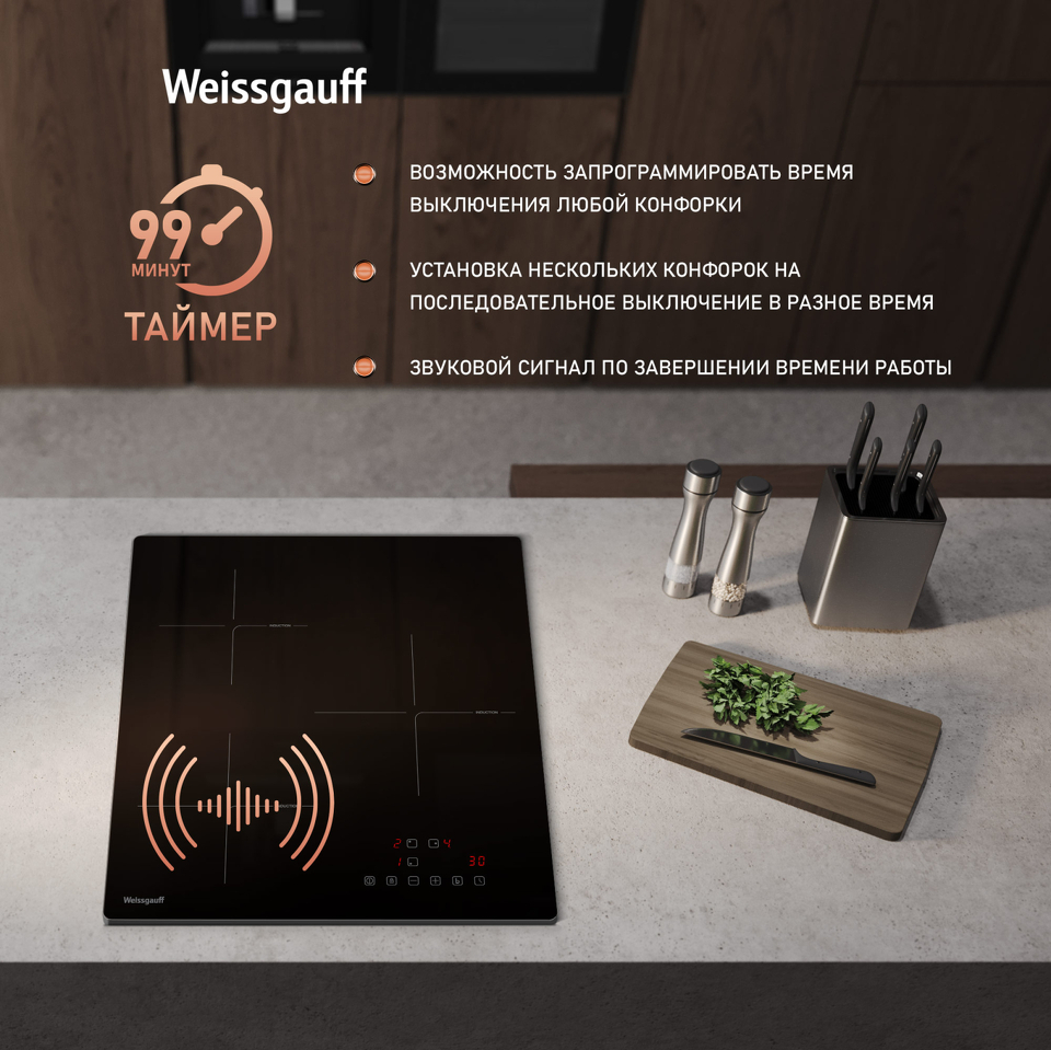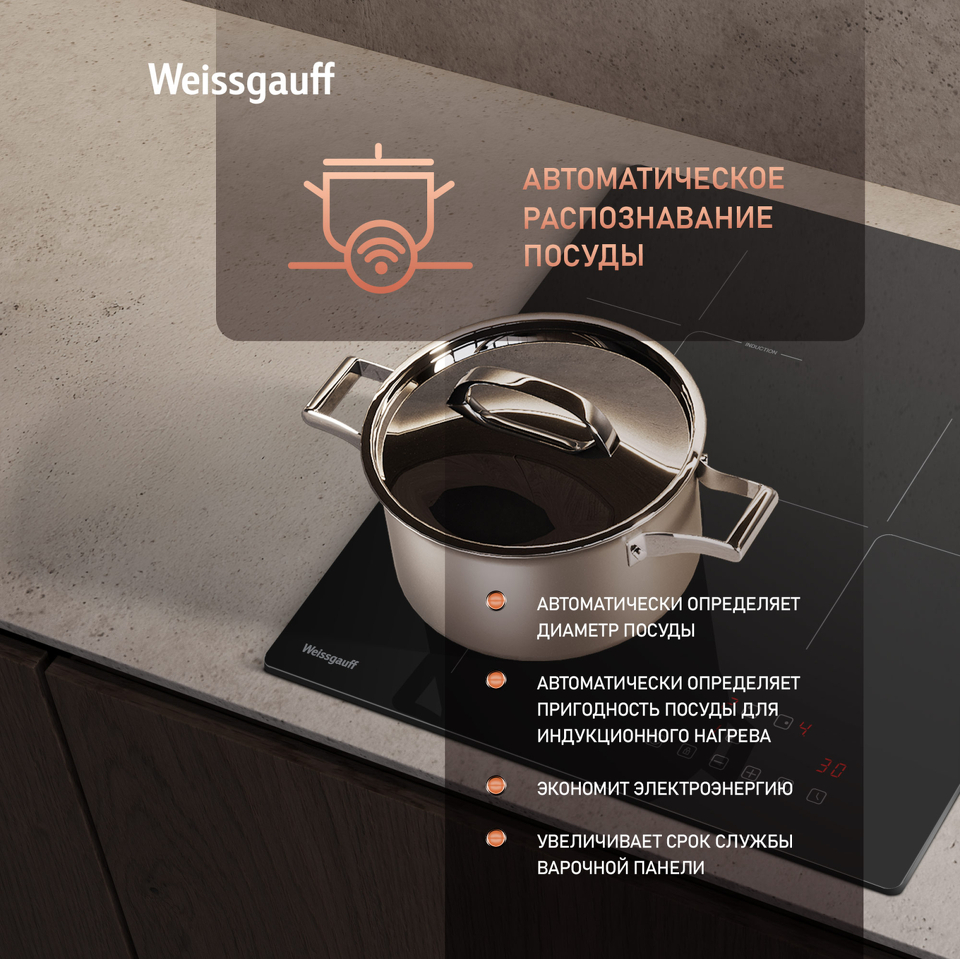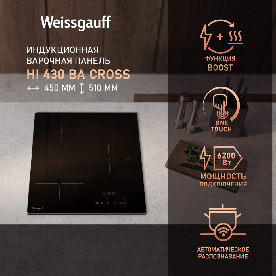 Индукционная панель Weissgauff с особым дизайном конфорок Cross Zone и опцией Boost- выводит на новый уровень понимание того, насколько эффективной может быть компактная индукционная варочная поверхность шириной всего 45 см!