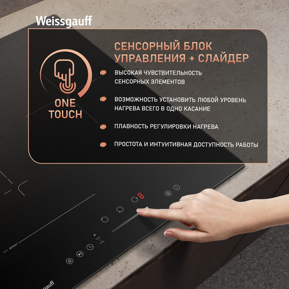 Блок управления-слайдер, позволяющий всего в одно касание выставить необходимый вам уровень нагрева любой из конфорок и делающий процесс управления панелью значительно более быстрым и легким.