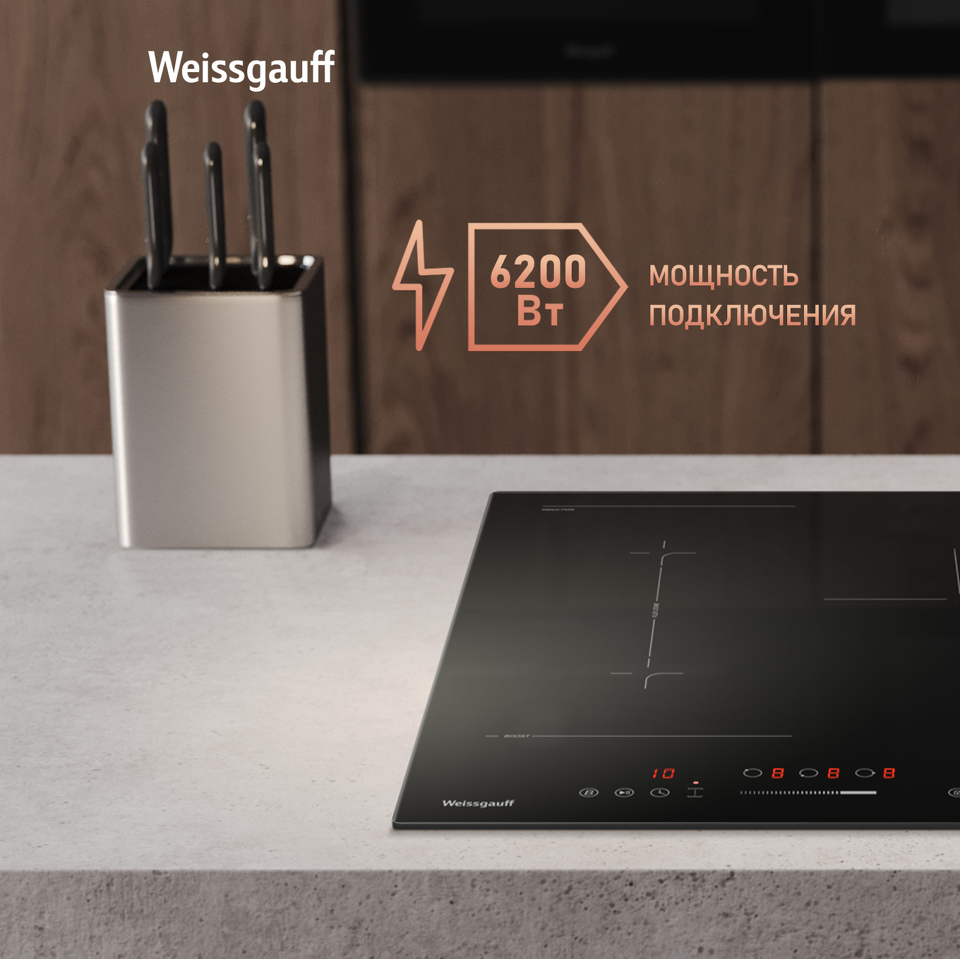 Максимальная мощность подключения 6200 Вт - делает данную модель по-настоящему мощной, позволяя вам готовить на всех трех конфорках одновременно, без потерь эффективности каждой рабочей зоны.