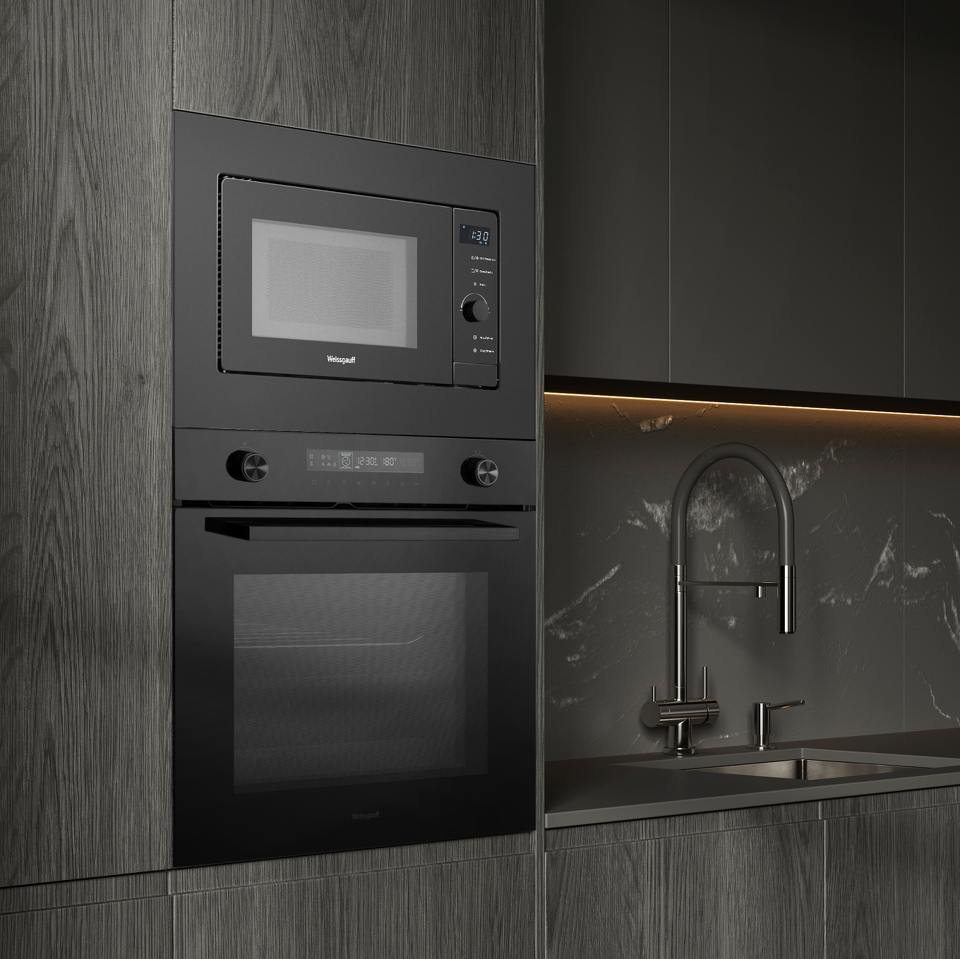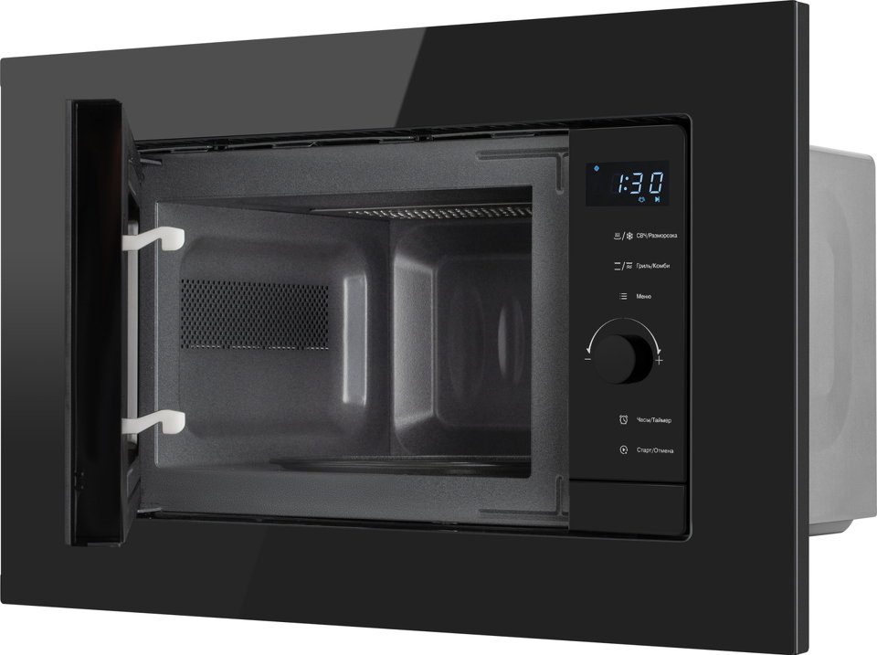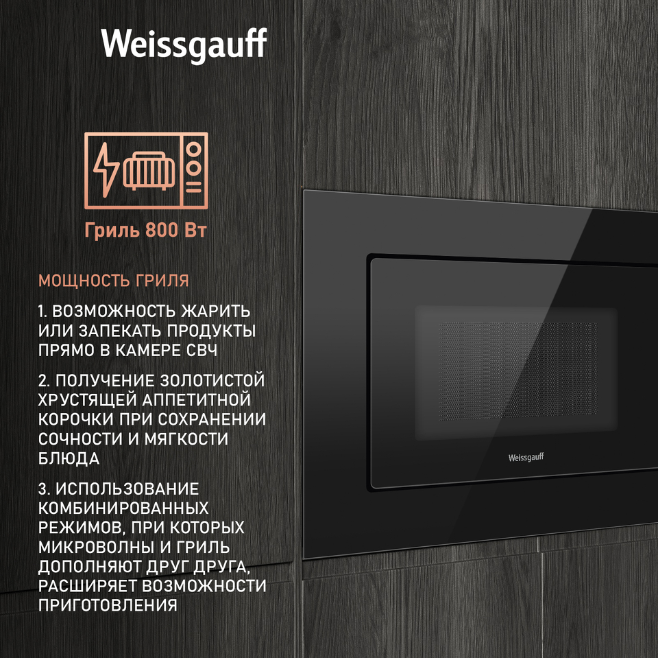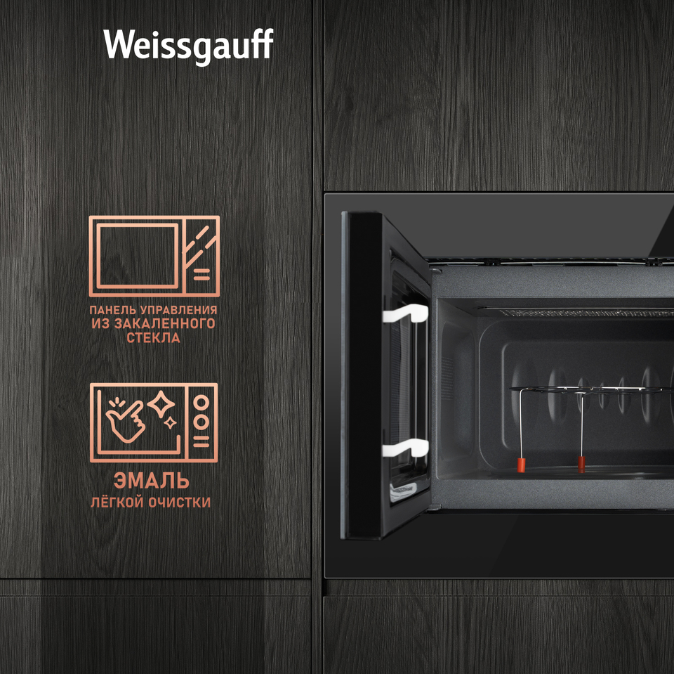 Встраиваемая микроволновая печь Weissgauff с объемом 20 литров, выполненная в черном закаленном стекле, равномерно разогревает еду при помощи поворотного стола, а также оснащена грилем с возможностью работы в комбинированном режиме и набором программ автоменю!
