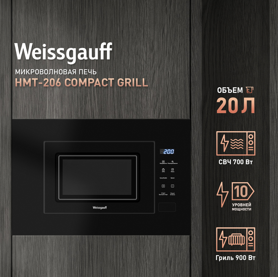 Встраиваемая микроволновая печь Weissgauff с объемом 20 литров, выполненная в дизайне Compact, сохраняющем свободное место на вашей кухне, с панелью управления в черном цвете, равномерно разогревает еду при помощи поворотного стола, а также оснащена грилем с возможностью работы в комбинированном режиме!