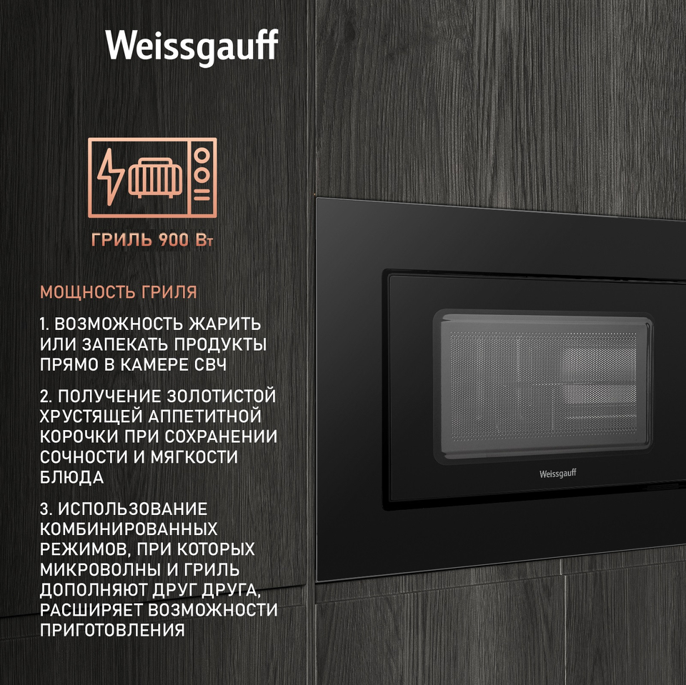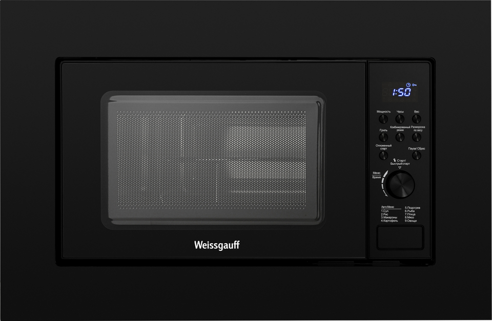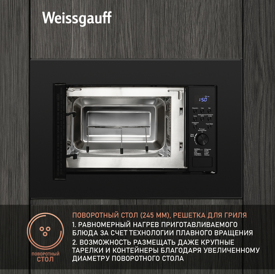 Встраиваемая микроволновая печь Weissgauff с объемом 20 литров, выполненная в черном цвете, равномерно разогревает еду при помощи поворотного стола, а также оснащена грилем с возможностью работы в комбинированном режиме и набором программ автоменю!