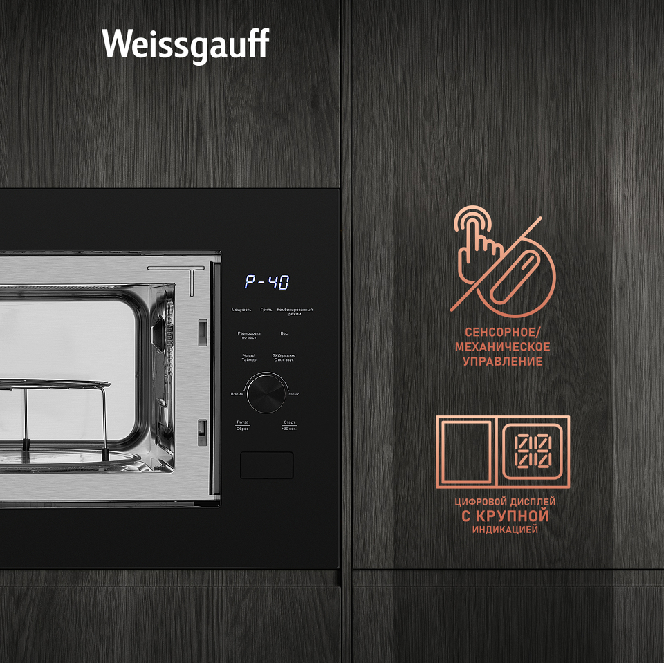 Встраиваемая микроволновая печь Weissgauff с объемом 25 литров, выполненная в черном цвете, равномерно разогревает еду при помощи поворотного стола, а также оснащена грилем с возможностью работы в комбинированном режиме и набором программ автоменю!