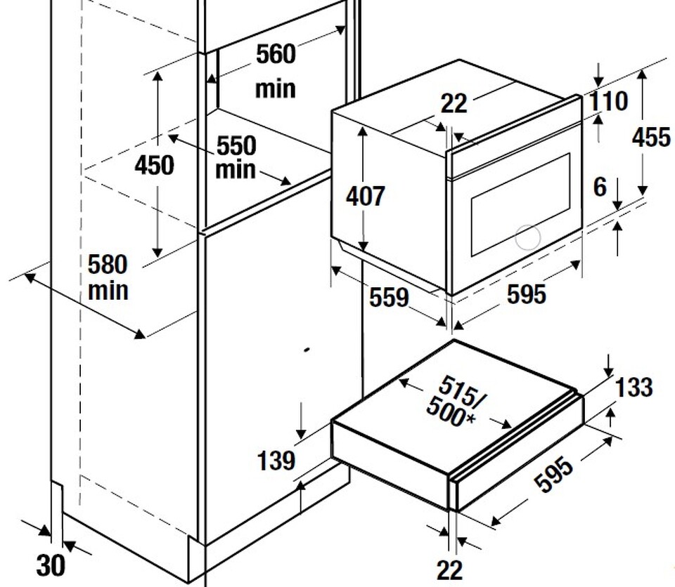 Размеры ниши для встраивания (мм) 595х560х550
