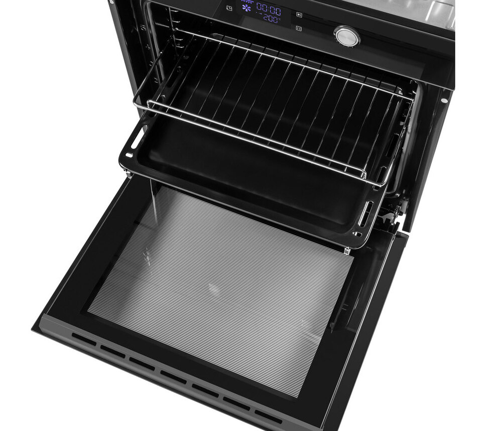 Фронтальная панель духовки выполнена из высококачественного жаропрочного тонированного стекла черного цвета. Ручка дверцы и ручки управления, сделанные из матированной нержавеющей стали, не нагреваются в процессе готовки.
