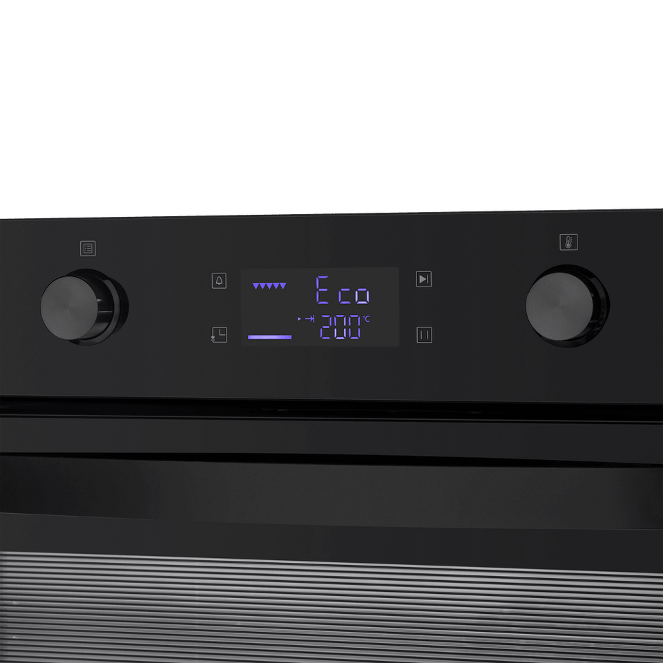 Комбинированное управление реализовано в виде сенсорного дисплея с подсветкой и поворотных ручек PUSH PULL, которые легким нажатием убираются внутрь корпуса. Можно выбрать режим работы, температуру (50°-250°C), установить таймер и блокировку от детей. В данной модели есть 9 режимов работы: традиционный нагрев, конвекционный нагрев, полный гриль, ЕСО, нижний нагрев, половинный гриль, разморозка, конвекция с грилем, освещение.