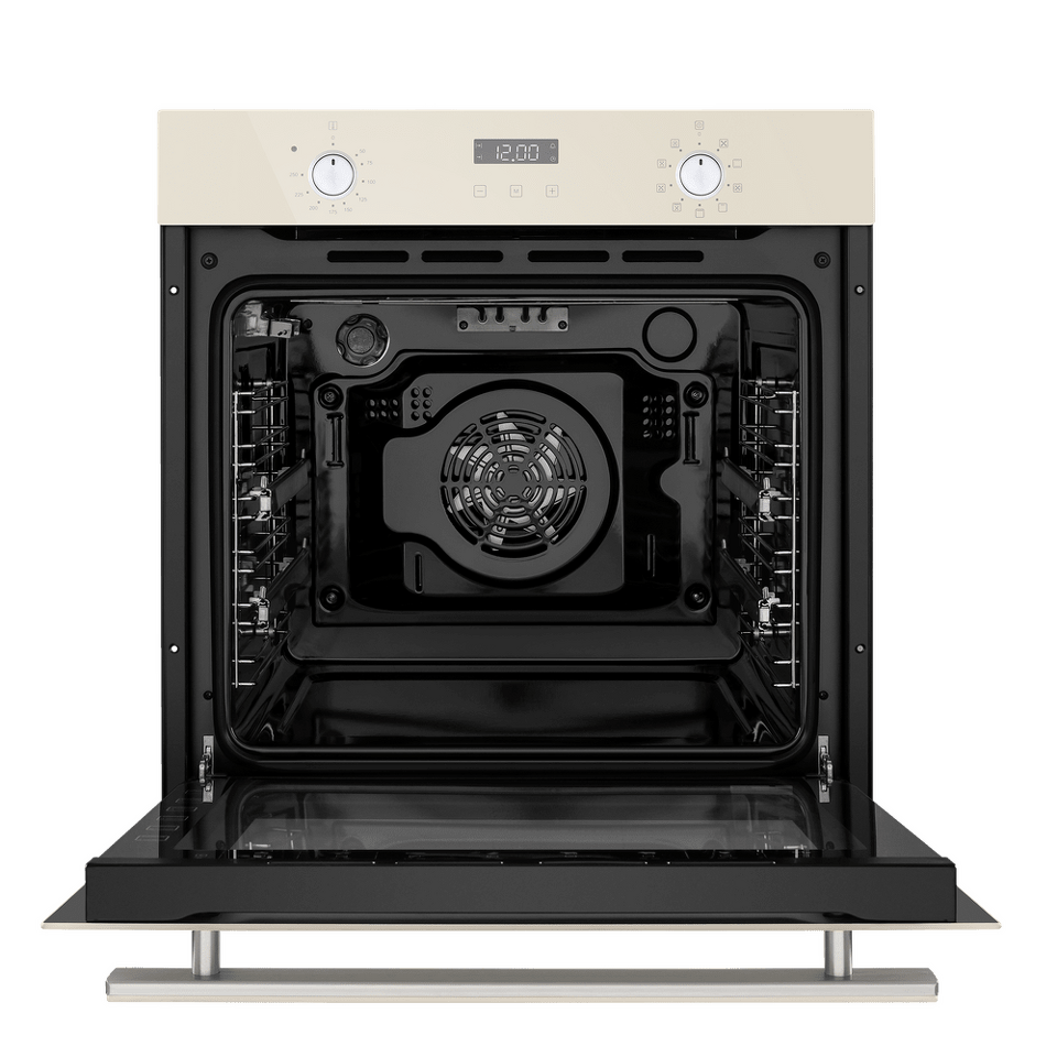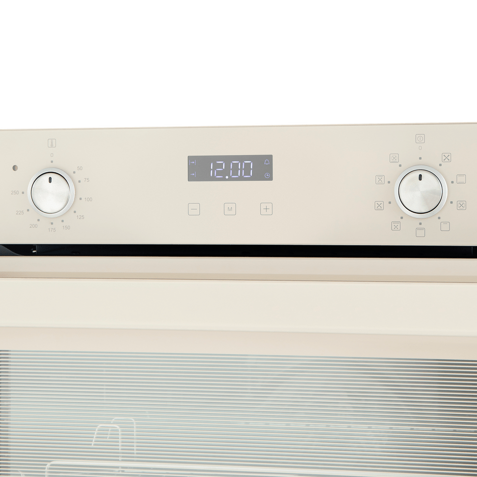 Фронтальная панель духовки и фасад ручки дверцы сделаны из высококачественного жаропрочного стекла бежевого цвета, окрашенного по всему объему, что является отличительной чертой бытового прибора премиум-класса.