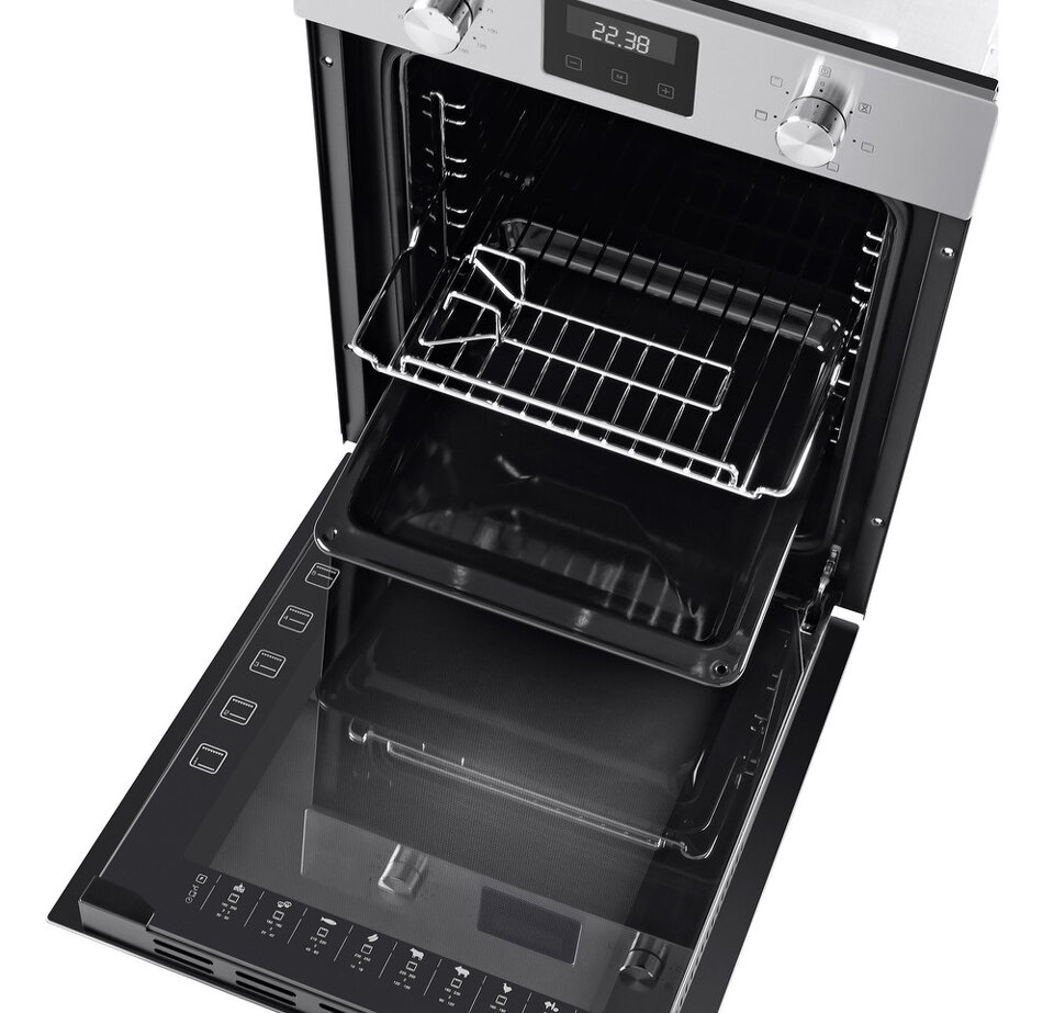 Комбинированное управление реализовано с помощью сенсорного дисплея и цельнометаллических поворотных ручек. Можно установить таймер, выбрать температуру (50°-250°C) и один из 7-ми режимов работы: внутреннее освещение, традиционный нагрев, большой гриль, конвекция с нижним нагревом, нижний нагрев, конвекционный нагрев, малый гриль.