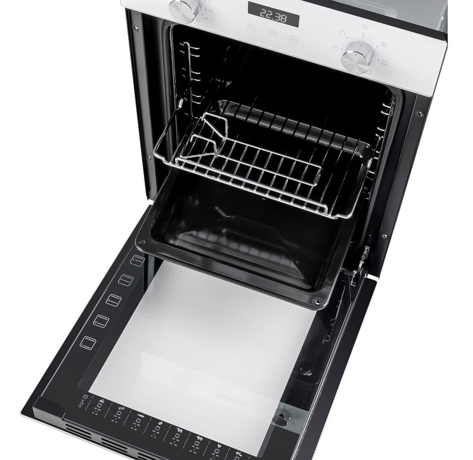 Фронтальная панель духовки сделана из высококачественного жаропрочного тонированного стекла белого цвета. Цельнометаллическая ручка дверцы остается холодной в процессе готовки.