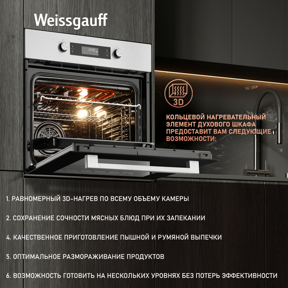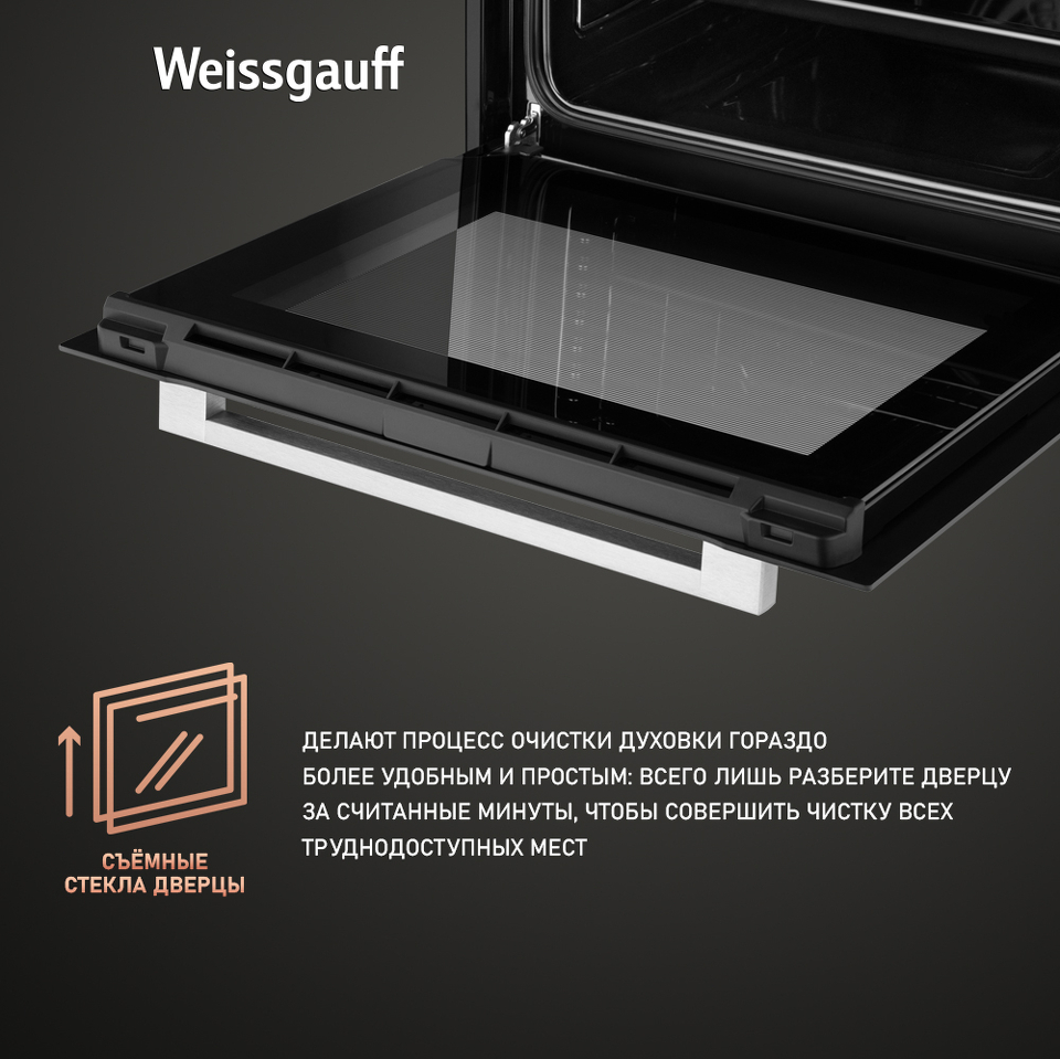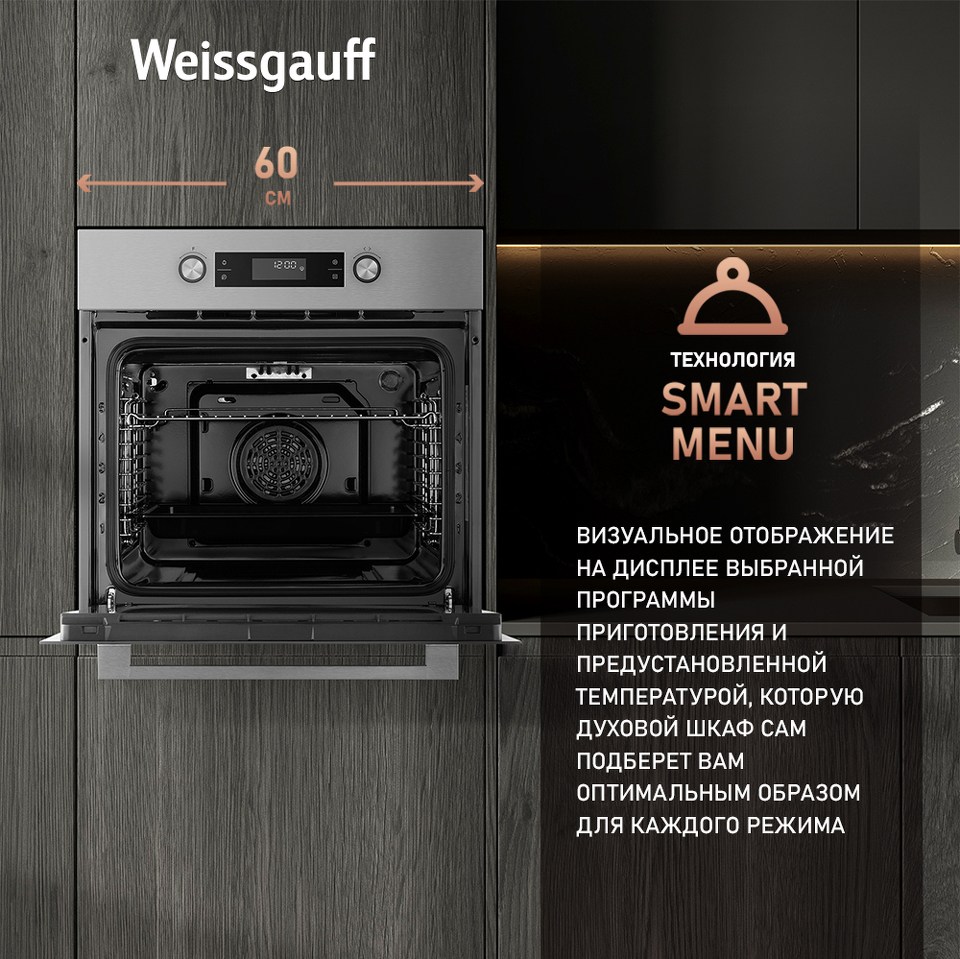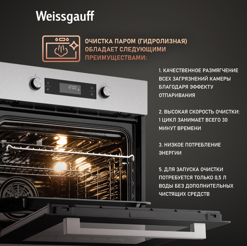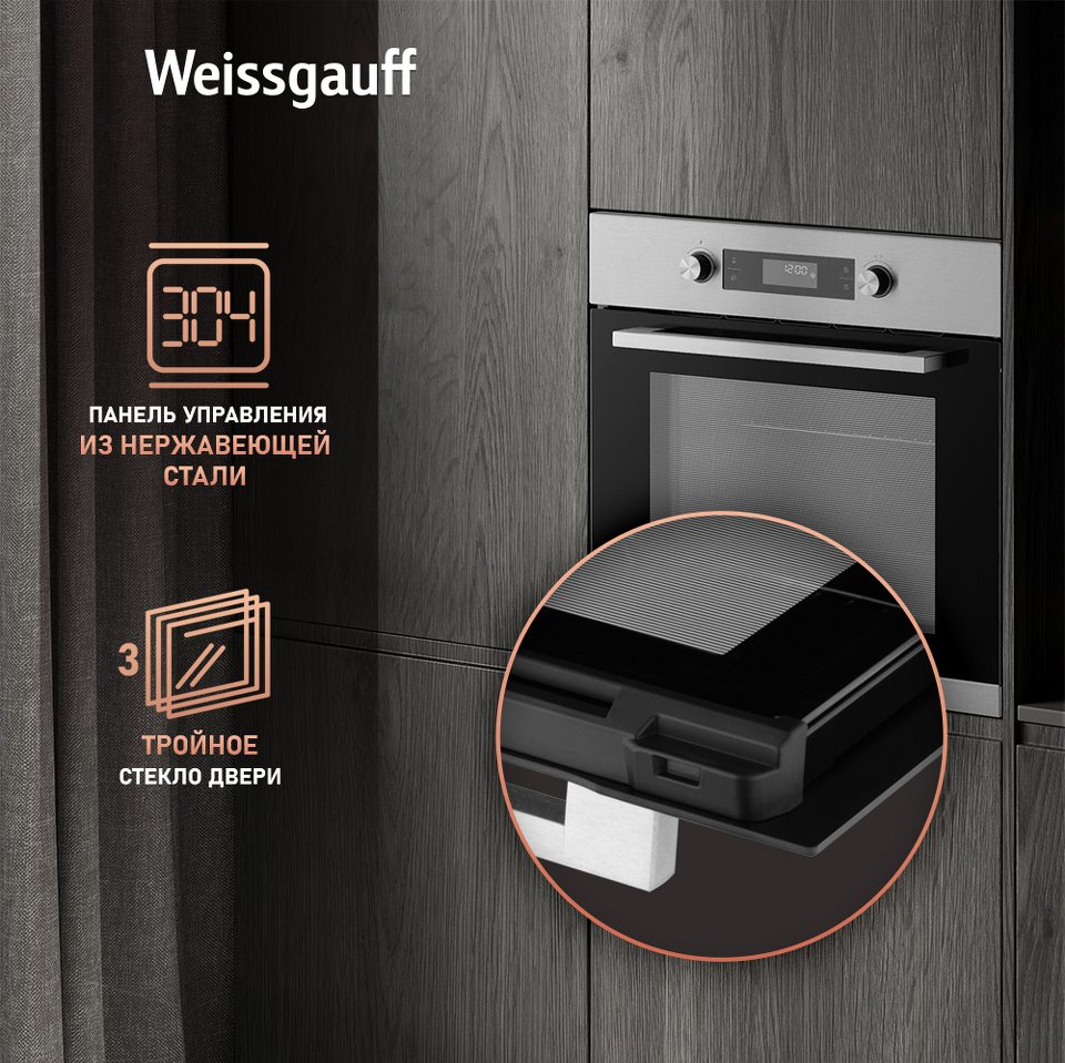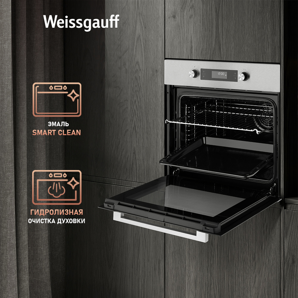 Новое поколение духовых шкафов от Weissgauff предлагает духовой шкаф, выполненный в великолепном дизайне в нержавеющей стали, имеющий современный дисплей с белой подсветкой и расширенной индикацией. Тройное остекление дверцы отражает всю ту предусмотрительность, с которой мы подошли к её созданию. Управление, реализованное сочетанием чувствительного сенсорного блока и утапливаемых рукояток PIPO, дополняет богатый функционал, представленный сразу 9 режимами! А возможность гидролизной очистки сделает уход за духовым шкафом еще проще и удобнее! Благодаря всему этому вы сможете полностью управлять процессом приготовления пищи, добиваясь идеального результата каждый раз!