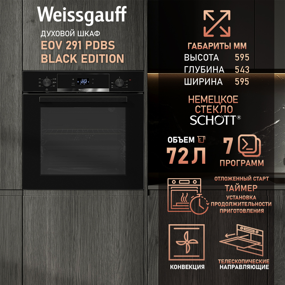 Новое поколение электрических духовых шкафов от Weissgauff предлагает модель, выполненную в черном цвете в дизайне BLACK EDITION. Управление, реализованное сочетанием чувствительного сенсорного блока и утапливаемых черных рукояток PIPO, дополняет богатый функционал, представленный сразу 7 режимами! А фантастический увеличенный объем XL 72 литра дополнит совершенство возможностей этого устройства! Благодаря всему этому вы сможете полностью управлять процессом приготовления пищи, добиваясь идеального результата каждый раз! Духовой шкаф Weissgauff станет не только отличным приобретением для вашей кухни, но и настоящим украшением интерьера, отражающим все благородство вашего вкуса и стиля!