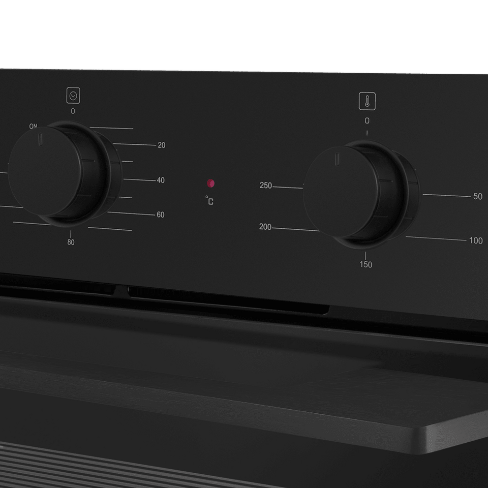 Встраиваемый электрический духовой шкаф с объемом 76 литров оснащен удобными телескопическими направляющими и простым механическим управлением с утапливаемыми переключателями.