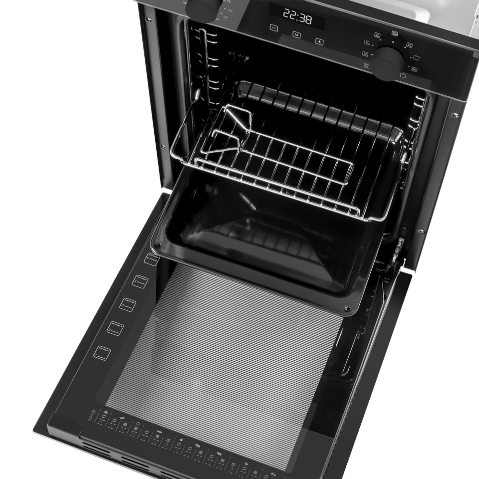 Компактный электрический встраиваемый духовой шкаф объемом 49 л. и шириной всего 45 см позволяет готовить ваши любимые блюда, разместив решетку или противень на одном из 5 уровней боковых направляющих. Внутреннее покрытие камеры выполнено из специальной легкоочищающейся эмали черного цвета.