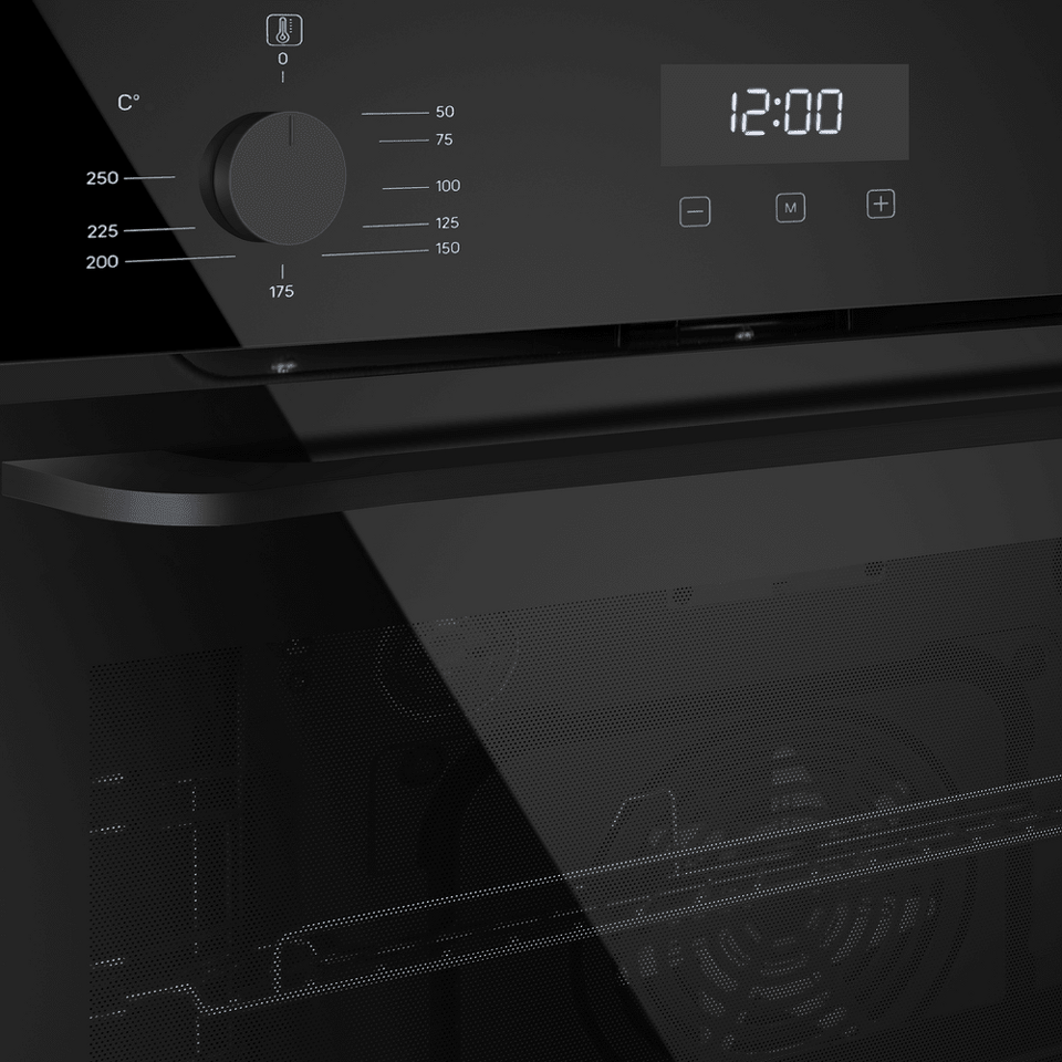 Комбинированное управление реализовано в виде сенсорного дисплея и поворотных цельнометаллических ручек PUSH PULL, которые легким нажатием убираются внутрь корпуса. Можно выбрать режим работы, температуру (50°-250°C), установить таймер.