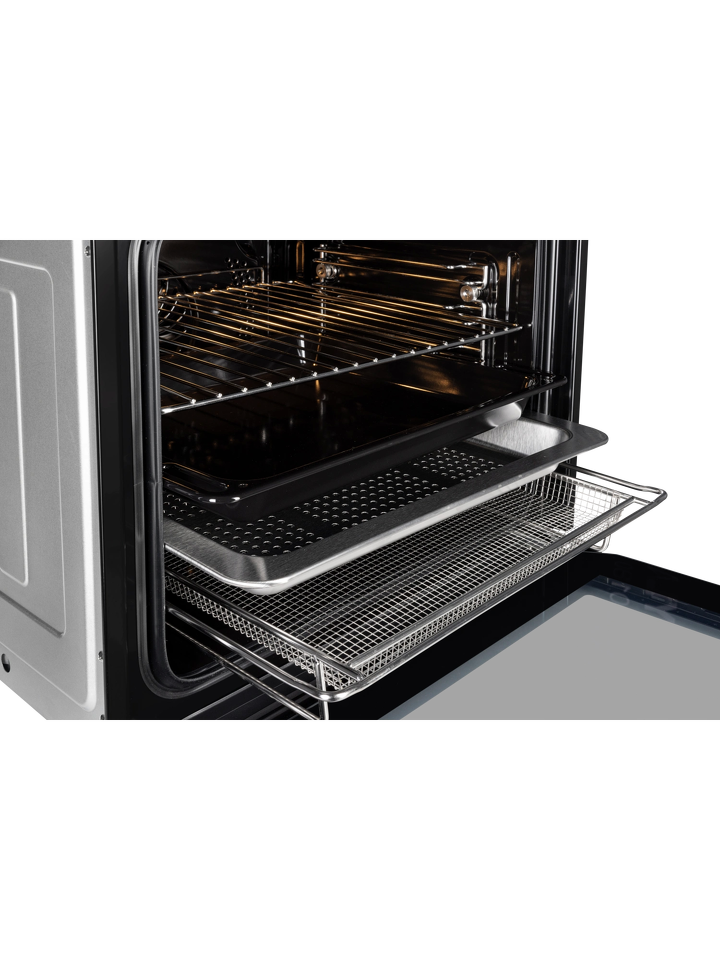 Внутри шкаф оснащен яркой внутренней подсветкой. Дверца из тройного съемного закаленного стекла обеспечивает дополнительную изоляцию и не нагревается снаружи. Перфорированный противень улучшает приготовление на пару. Сетчатый противень позволяет готовить блюда в режиме «Фритюр». Также духовка укомплектована эмалированным противнем и хромированной решеткой.
